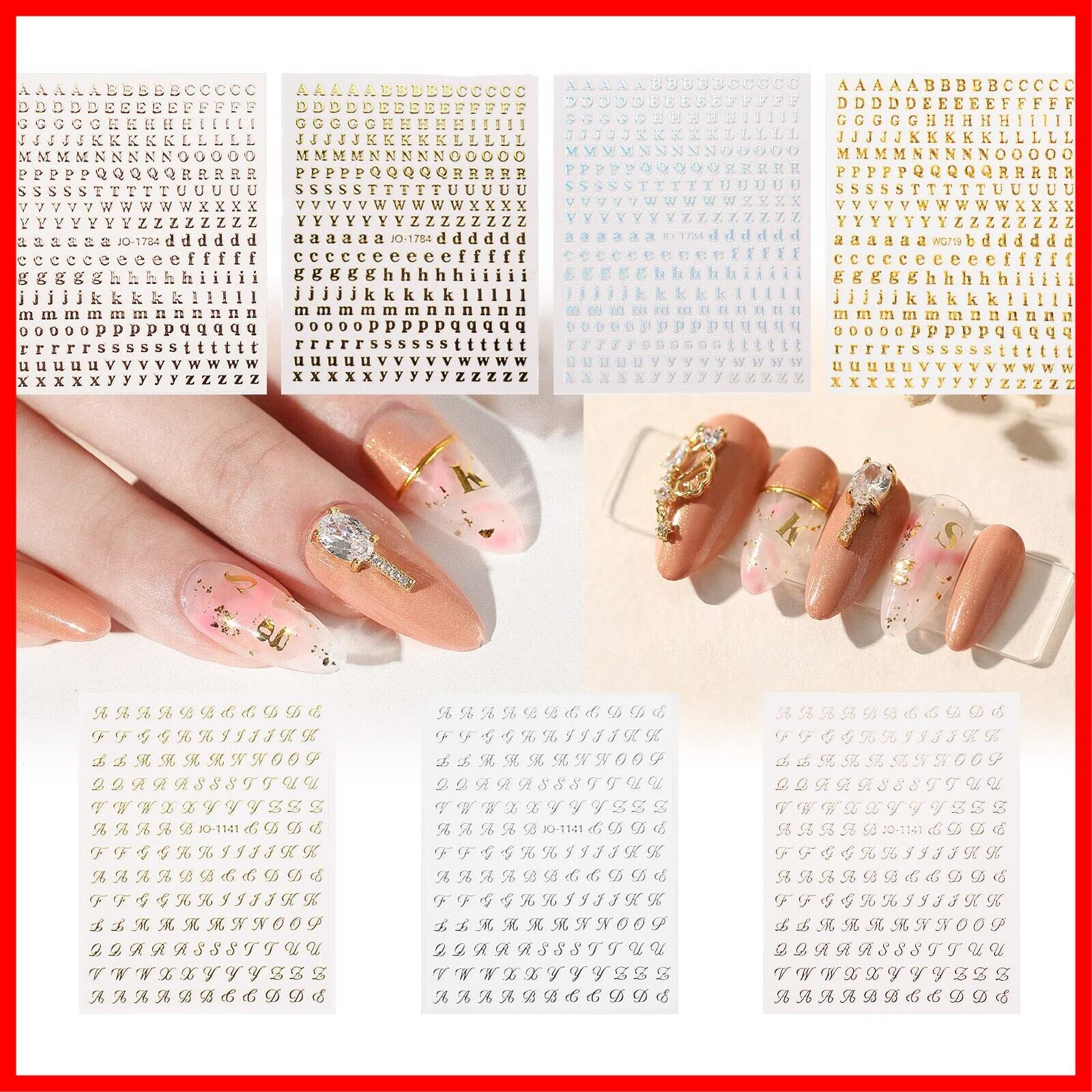 【2種類のパターン】ブロック体と筆記体の2種類のネイルシール イニシャルを含み、4色で、ニーズのため主にゴールドをご用意しています。