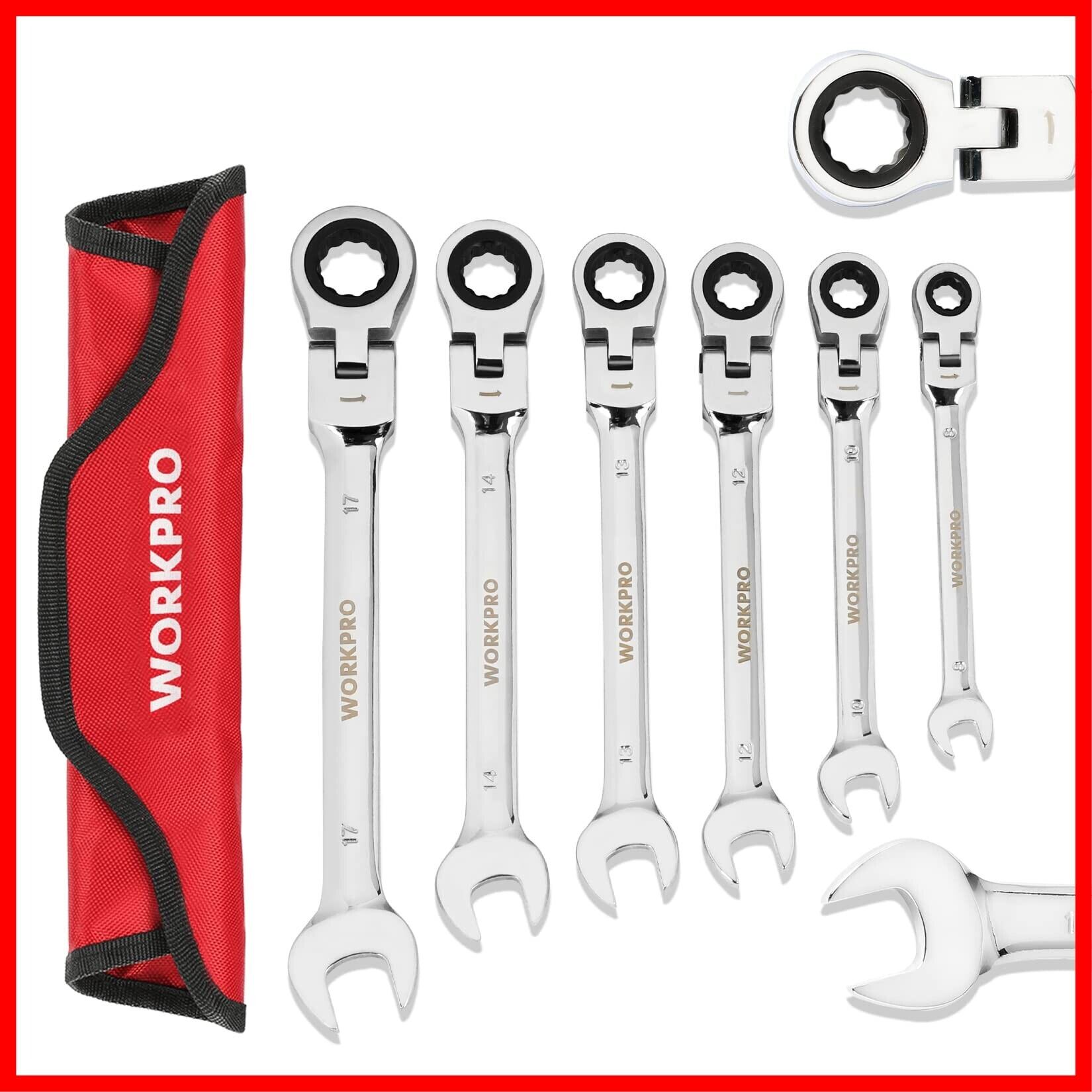 WORKPRO フレックスラチェットレンチ 首振りラチェット コンビネーションレンチセット コンビセット 両用ヘッド スパナ レンチ 角度調整可能 72ギア 6本組 自動車修理 車メンテナンス 組み立て DIY用 収納袋付き