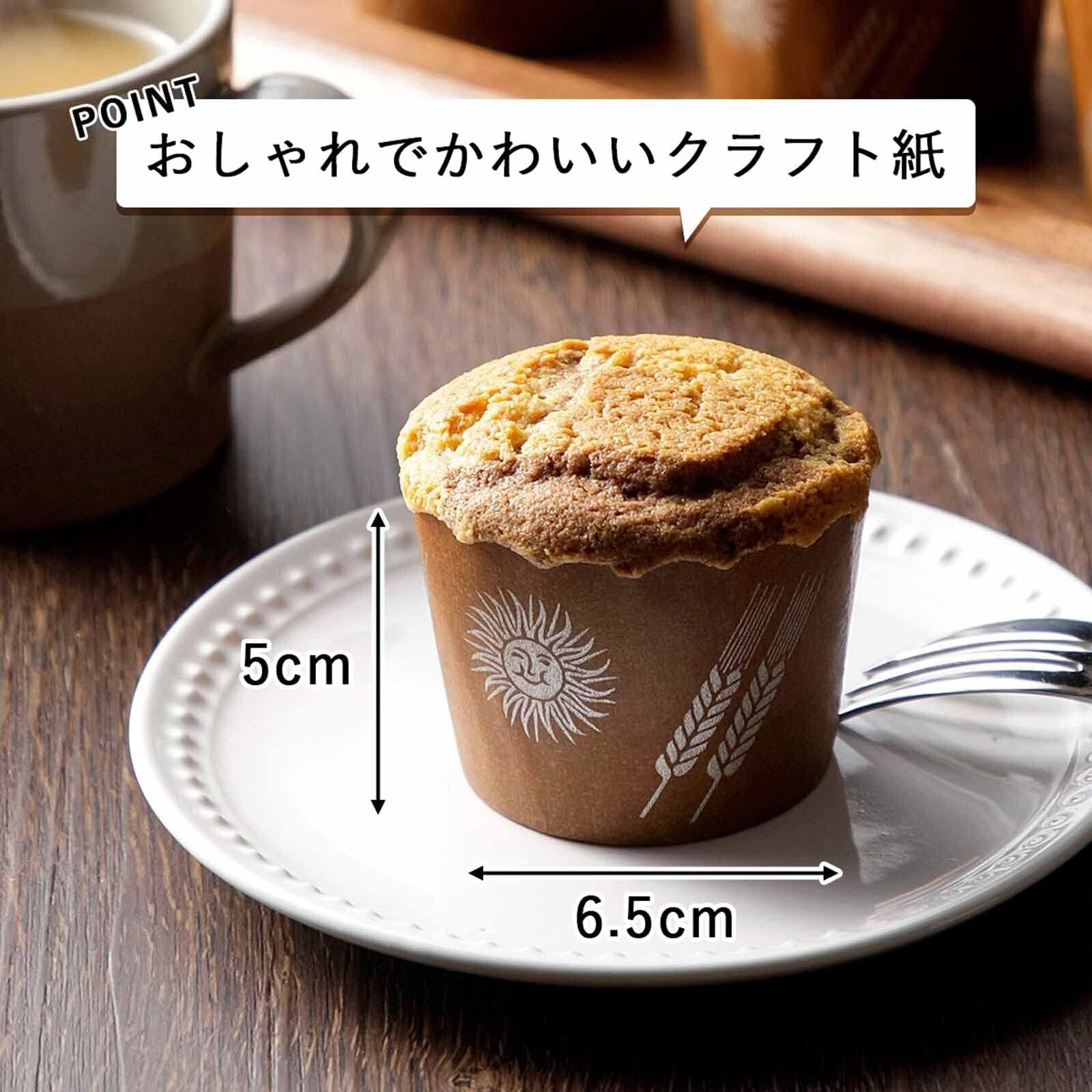 マフィン型50枚のお徳用セット。※220℃以上でのご使用と容器だけの空焼きは避けてください。 品番 15726 材質 クラフト紙 サイズ 径6.5×高さ5cm 重量 60g(セット) 生産国 日本 JANコード 4957423010856