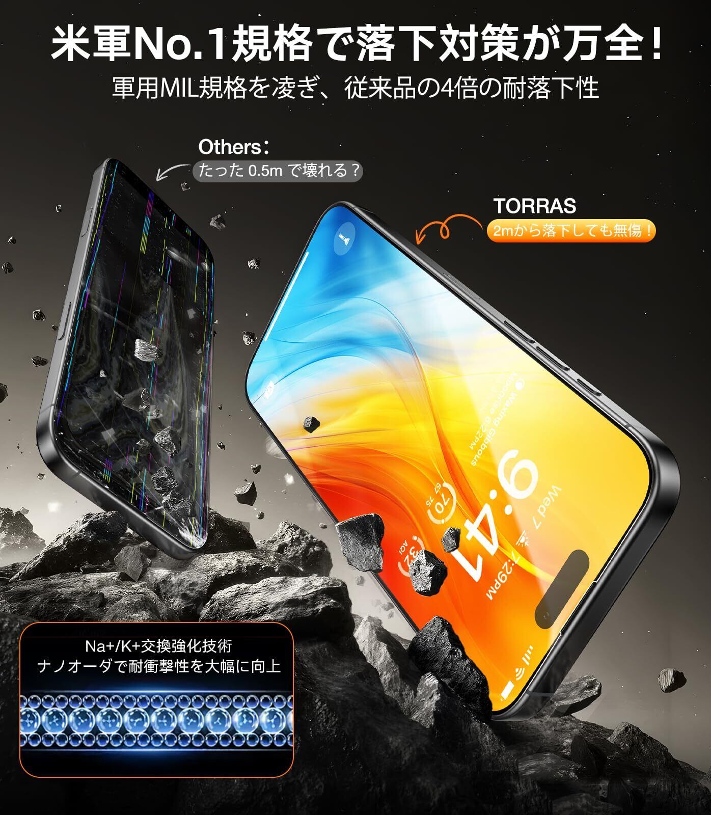 【航空宇宙用材料・表面硬度9H+Hv673】iPhone iPhone 16用/iPhone 15用 ガラスフィルムは日本製AGCの航空宇宙技術から生まれた「Dragontrail」(2024 6.3インチ)ガラスを採用し、表面硬度が9Hを超え、鉱石の硬さを示すビッカーズ硬度Hv673を実現する。これにより、耐衝撃性が市販品よりも20倍向上し、激しい衝撃や圧力、摩擦からスマホを確実に守る。過去10年間にわたる保護技術の革新を受け継ぎ、世界20カ国で累計「9600万枚」を販売した。しかも、これまでに「アイフォン用の画面破損ゼロ」の実績を誇る。ちなみに、保護や美観を高めるため、TORRASのiPhone 16用/iPhone 15用の保護ケースとの併用をおすすめ!