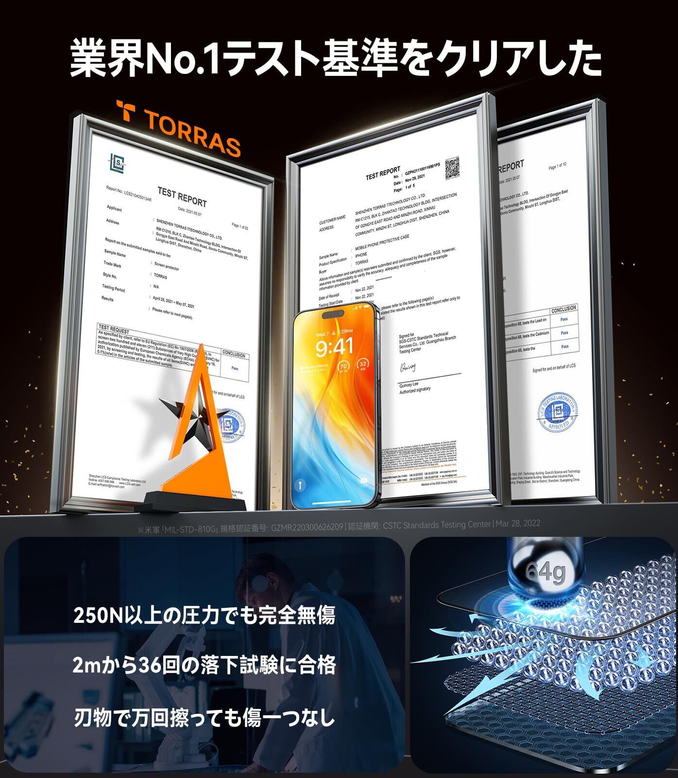 【米軍MIL規格越え・隅々まで全面保護】 Na+/K+イオン交換強化、焼き戻し超二重硬化、SCL緩衝層などの30を超える革新的な技術により、アイフォン16/15専用 フィルムの表面に圧縮応力層を生成し、伝わる衝撃力(250+Nを吸収可能、2m落下無傷)を瞬時に分散させ、画面割れを徹底的に防ぐ、本当に画面保護と絶対的なあんしん感を与える。更に、曲線に従って全画面を覆うことで、エッジに極限まで磨いたラウンド加工技術を採用し、引っ掛かりもなく、ぴったりで装着感なく、どんな角度から落ちてもフチ割れの心配はご無用。その上で、ケースとの相性も抜群で、浮き上がらず、縁に埃も寄せ付なし、いつも清潔で、綺麗に!※米軍「MIL-STD-810G」規格認証番号:GZMR220300626209|認証機関:CSTC Standards Testing Center|Mar 28, 2024(スクリプトが模倣される偽造品が多いため、認証番号や証明書のない商品には十分ご注意ください!)
