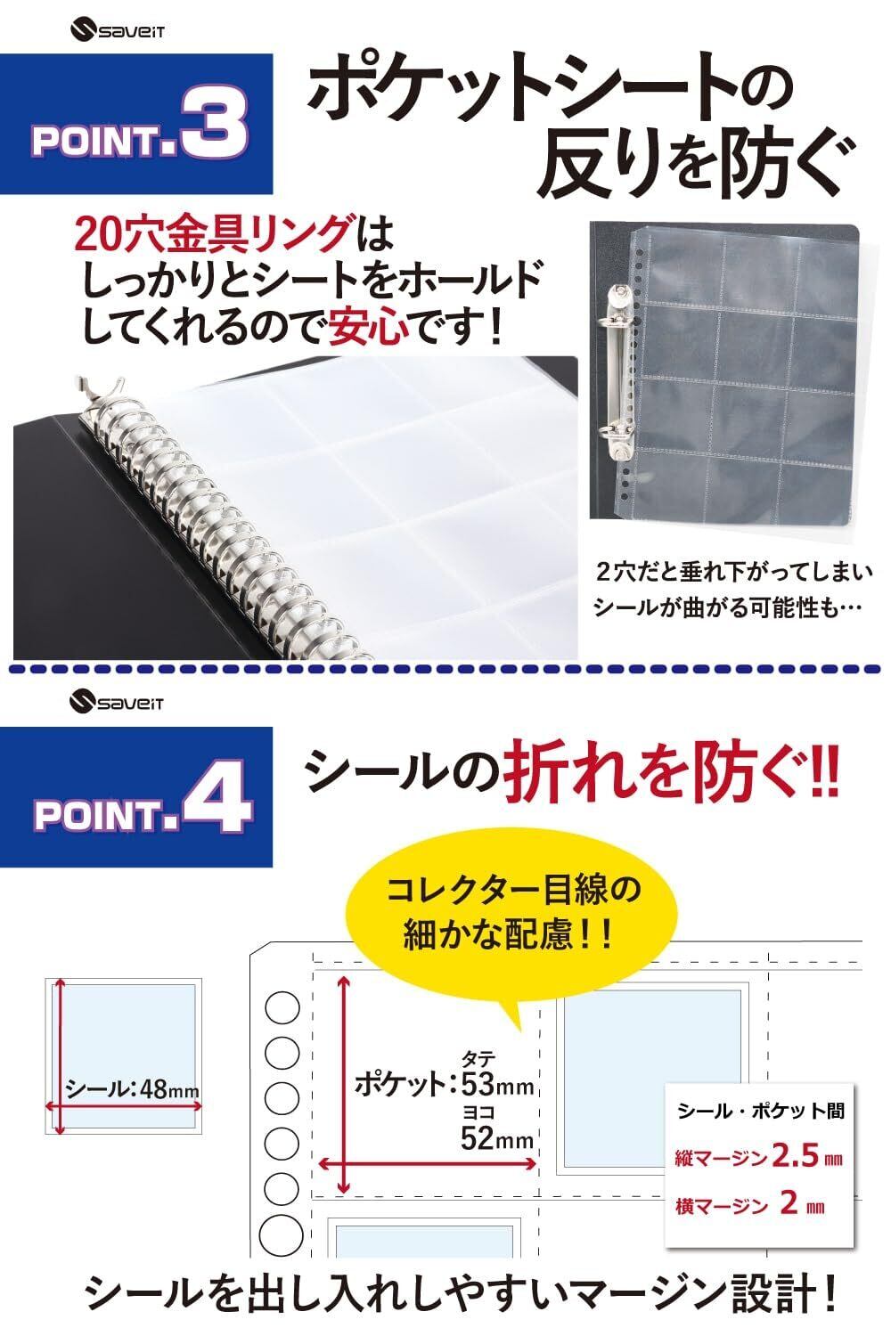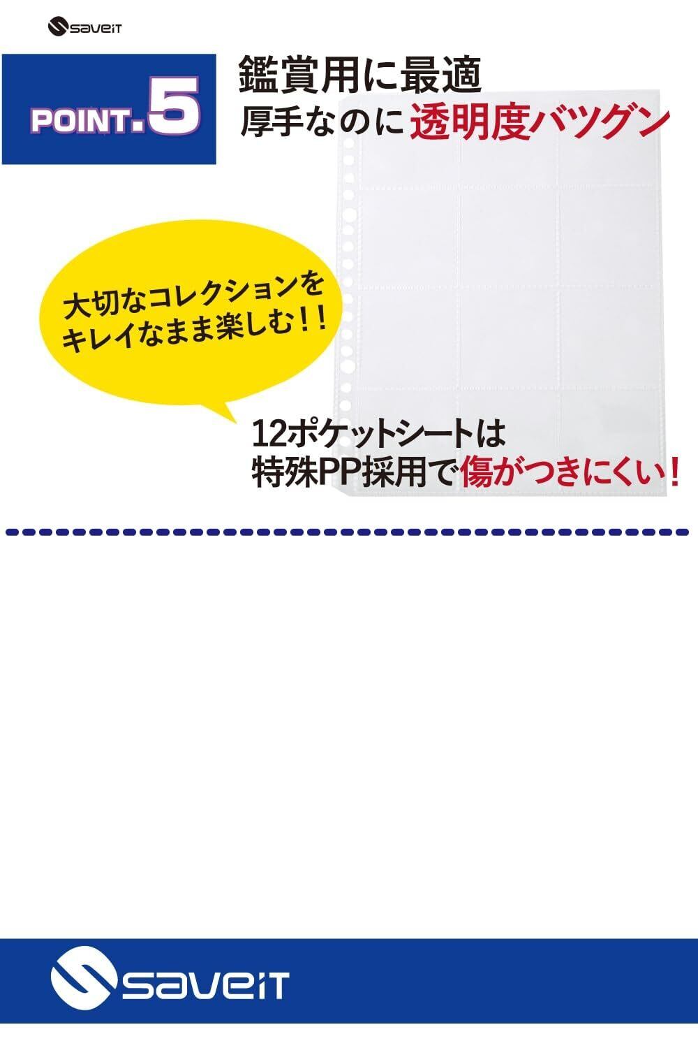 【汚れやホコリからシールを守る!】 商品画像のようにシールを12ポケットシートに上から挿入します。ポケットシートの使用で汚れやホコリなどの侵入から大切なシールをかんたんに保護・保存します。 【国内生産だから安心!】 当商品に使われている12ポケットシートは、日本国内で生産しています。は創業50年を超えており経験豊富で各分野で実績多数の国内です。国内だから「安心・安全・高品質」「供給も安定している」「不具合に迅速に対応可能」など数々のメリットがあります。 生産工場と様々な面で距離が近いことにより、コレクターの皆様の声を反映し、改善を重ねていきやすい環境が整いました。