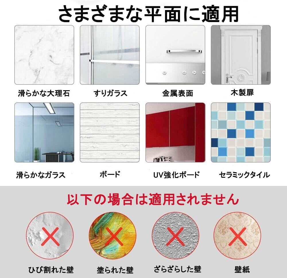 【使用範囲 】滑らかな面である板壁、家具や机(木・スチール製)、ステンレス、冷蔵庫や洗濯機などの金属塗装面、大理石面、タイル面、ガラス面、プラスチック面など。フックは壁紙に取り付けることができません。剥がすと壁紙が破損しますので、ご注意ください。