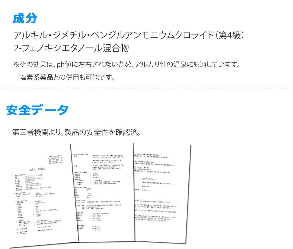 一般家庭の浴槽150~200リットルのお湯に対して15mlを投入して入浴する除菌剤です。お湯に潜む様々な細菌を除菌し清潔にご入浴いただけます。また、お湯自体のヌメリやニオイも消臭除去します。
