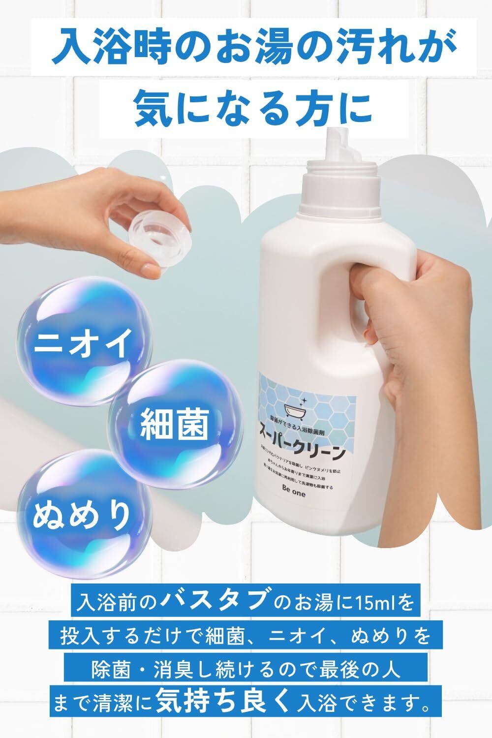 除菌できる入浴除菌剤 スーパークリーン入浴除菌剤 浴槽に潜むバクテリアや細菌を除菌・消臭し清潔に入浴 ビーワンショップ (900ml 計量キャップ 60回分)