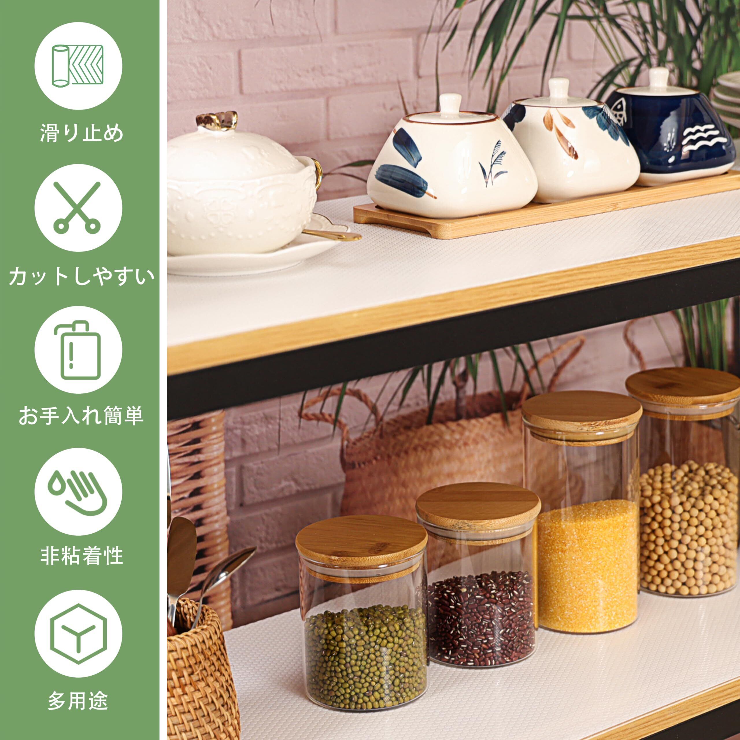 [滑り止め・非粘着性] 両面とも非粘着性の素材なので、ライナーを簡単に取り出して掃除することができます。 食器棚シートは、虫、油、汚れと台所用品の滑りを防ぎ、カビの発生を有効に予防できます。台所用品や本やなどの品物の保護に役立たちます。