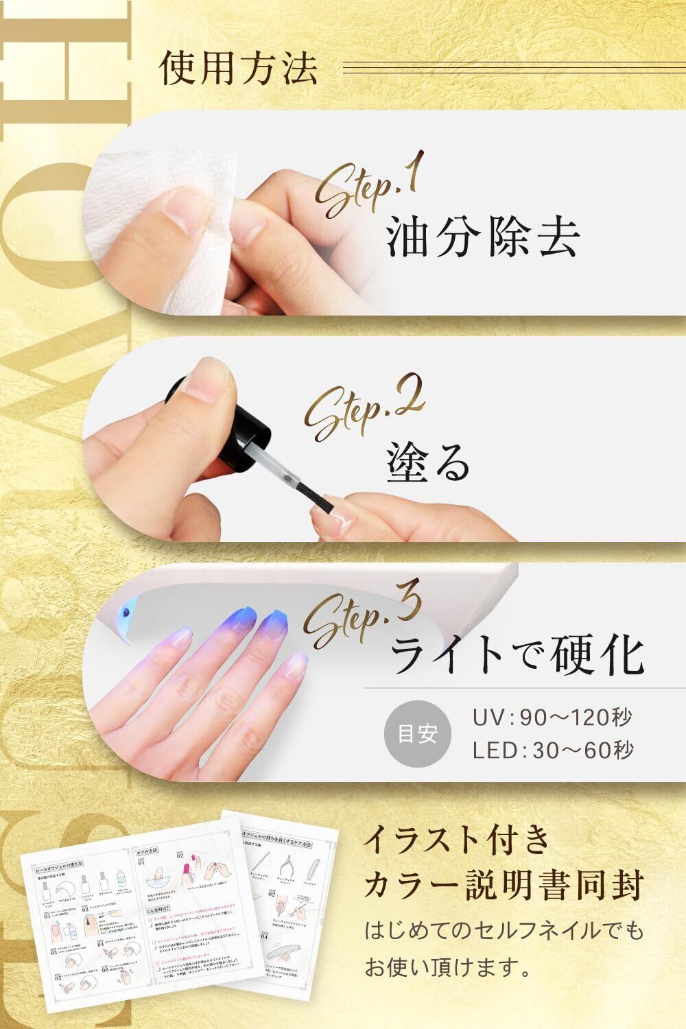 【使用方法】 ピールオフジェルを塗った後、ライトで硬化します。(目安:UV:90~120秒、LED:30~60秒)