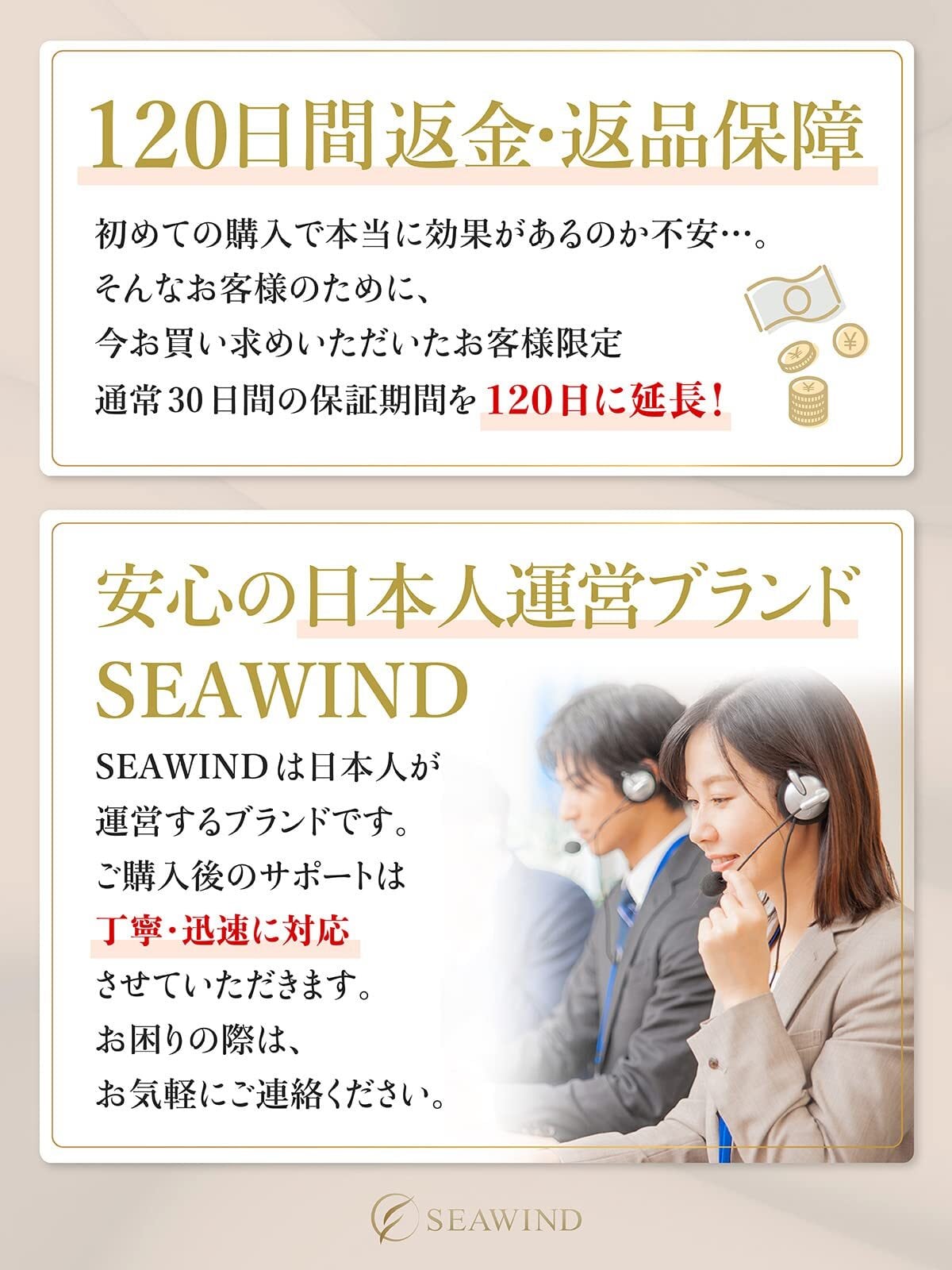 【日本による安心!】SEAWINDは日本のです。万が一商品にご満足いただけない場合は、商品到着日より120日以内であれば、返金・返品対応いたします。 「壊れてすぐだめになった」「購入したに問合せたら、使い方が悪いと言われた」 そんな心配はもう必要ありません。長くご愛用頂きたいからこその長期です。何かご不明点等ございましたらお気軽にお問い合わせください。
