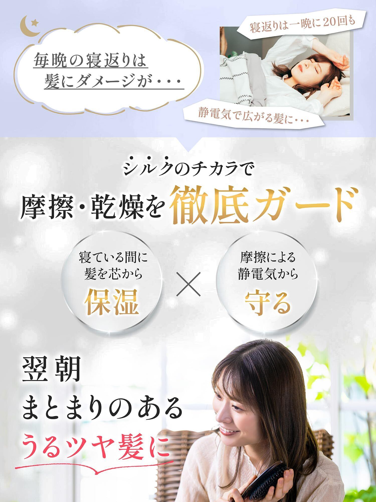 【寝ながらヘアケア】シルク枕カバーに含まれるタンパク質は、枝毛・縮毛・曲がり・乾燥を最小限に抑え、髪と髪の摩擦を軽減する効果があります。シルク枕カバーは長く使っていくうちに、髪が段々柔らかく滑らかになって光沢がでてきたりと髪質改善を実感できます。睡眠中のヘアケアアイテムとして、シルク枕カバーは大人気です。