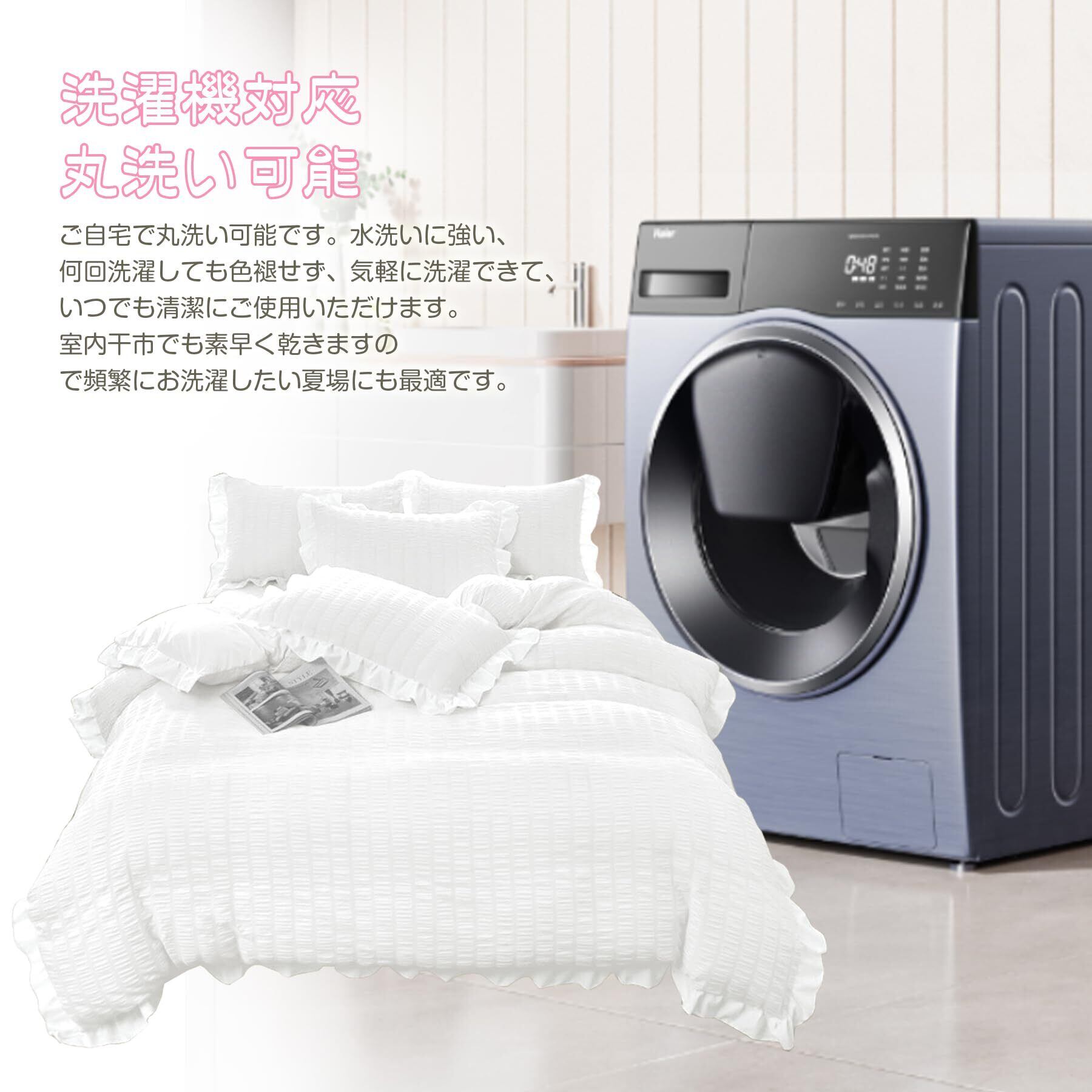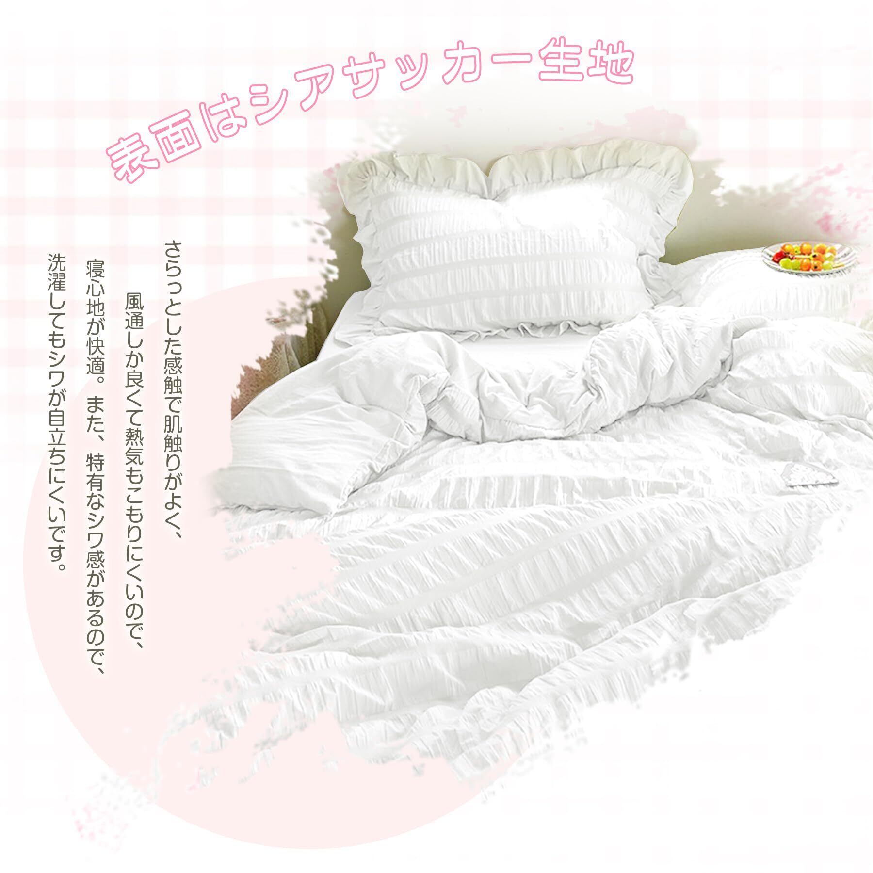 布団カバー AYO セミダブル・4点セット シアサッカー生地 フリル付き 掛け布団カバー ベッドカバー 枕カバー ボックスシーツ 寝具カバーセット ピーチスキン加工 洋式和式兼用 洗い替え 速乾タイプ(ホワイトセミダブル・4点セット)