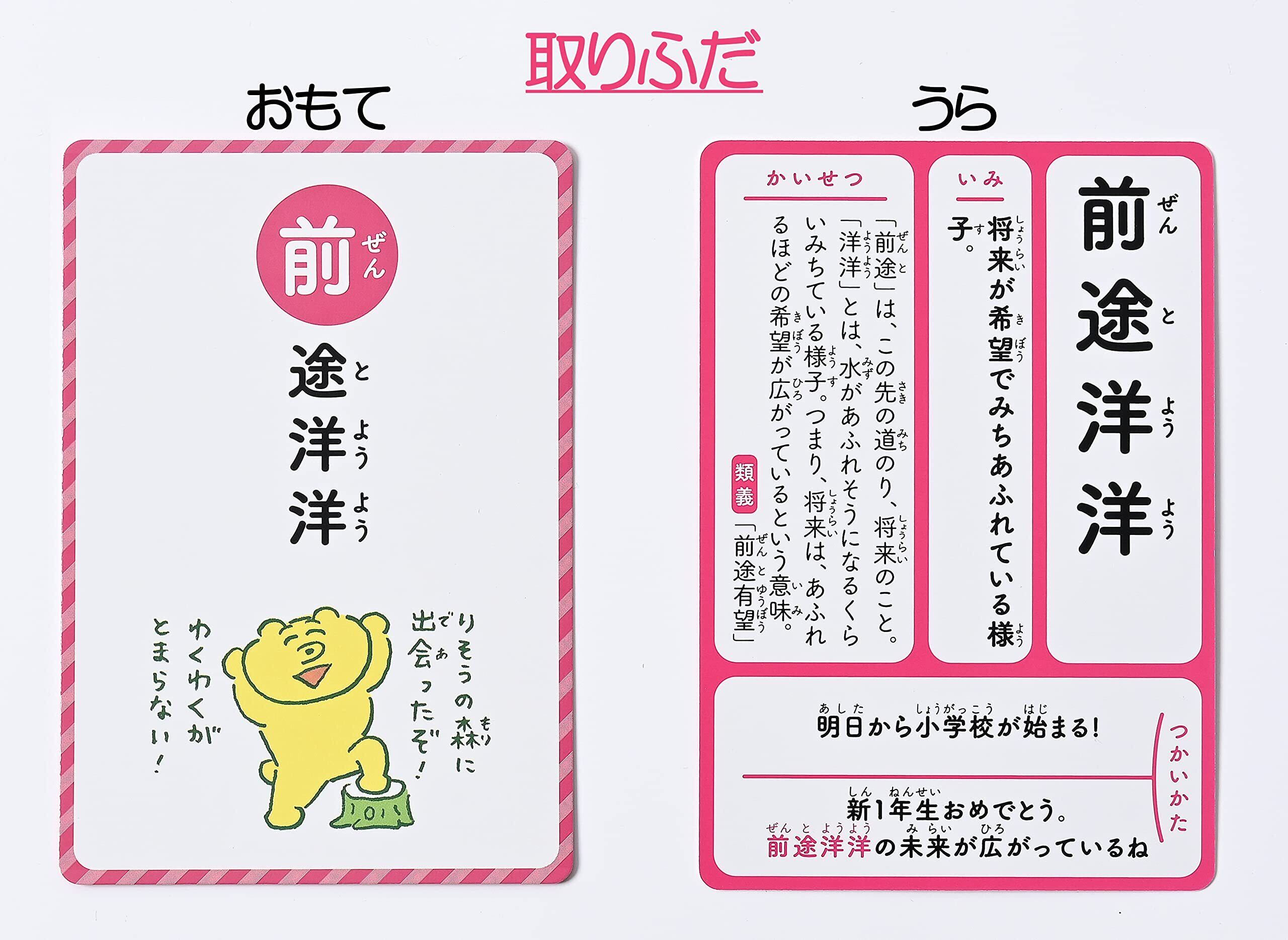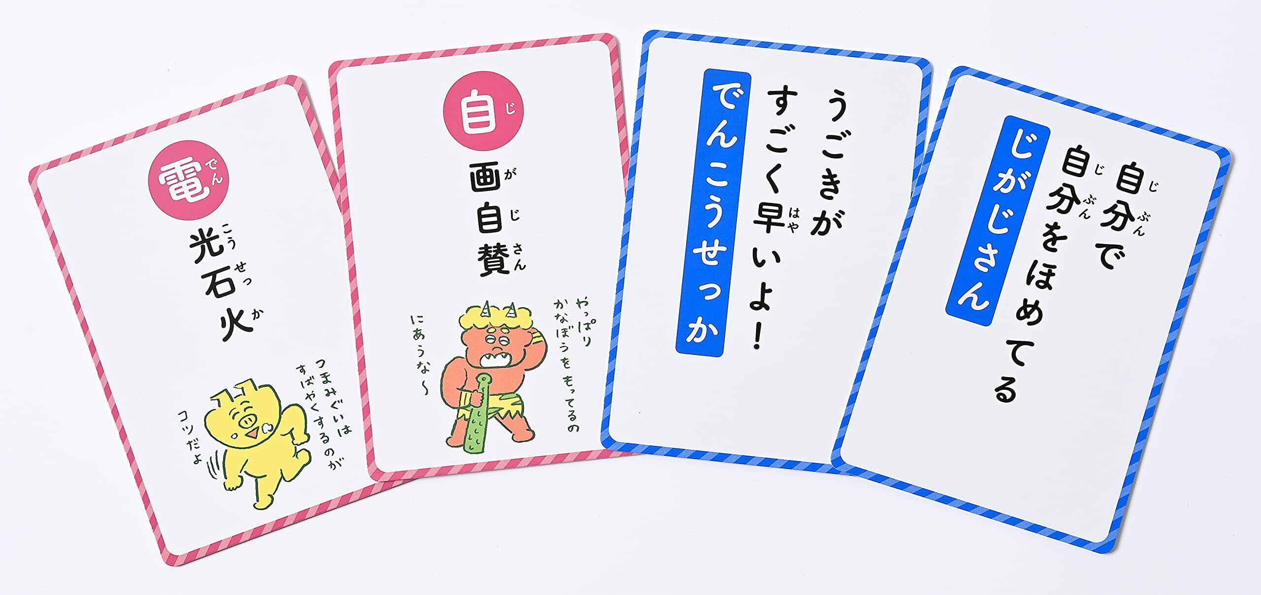 ・「読み札」の文は、四字熟語の意味を短く分かりやすく表現。リズムよく読み上げることで自然に覚えられます。