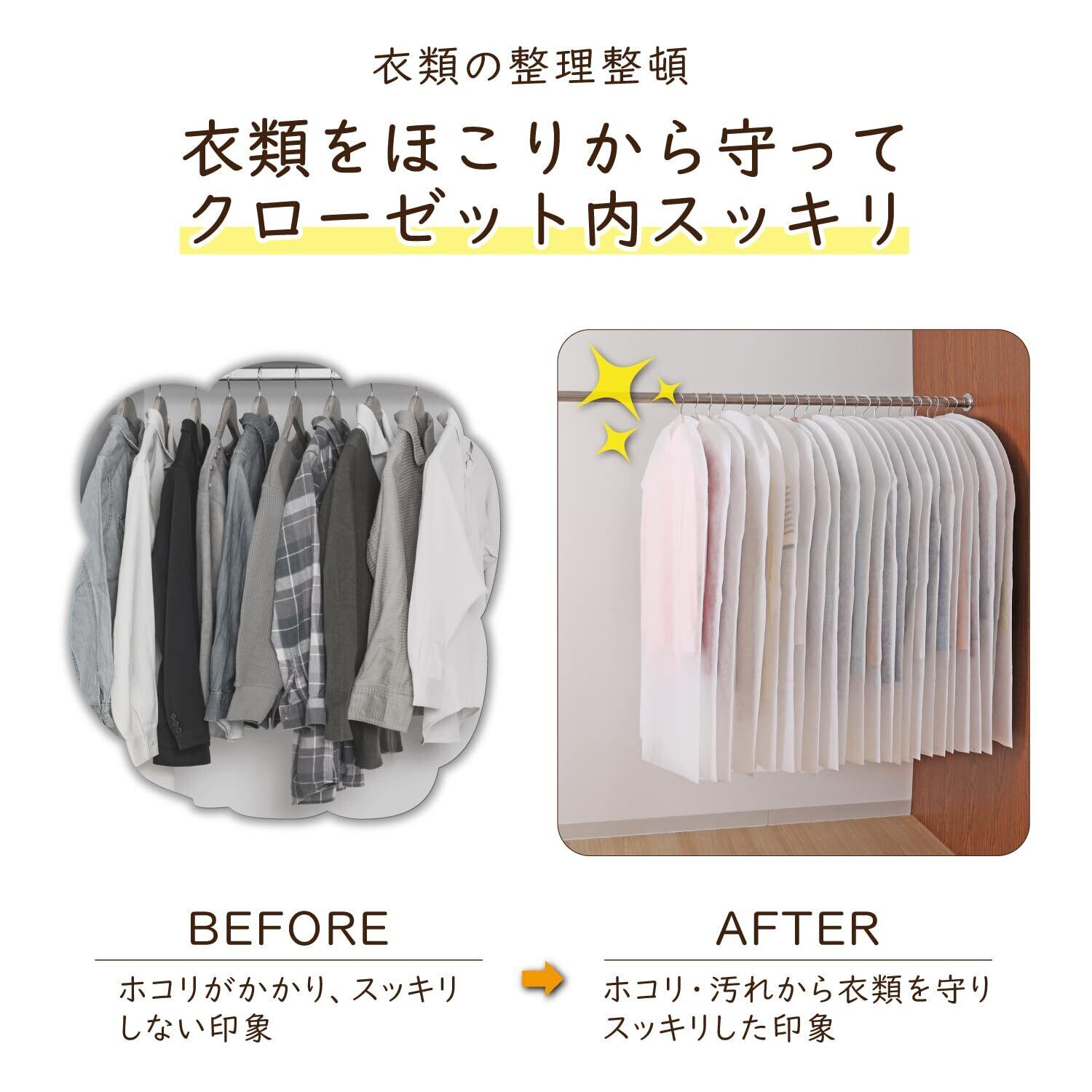 【オフシーズンの洋服や礼服などをホコリから守る】:オフシーズンの洋服やジャケット、普段着用しない礼服などをホコリから守り保管。