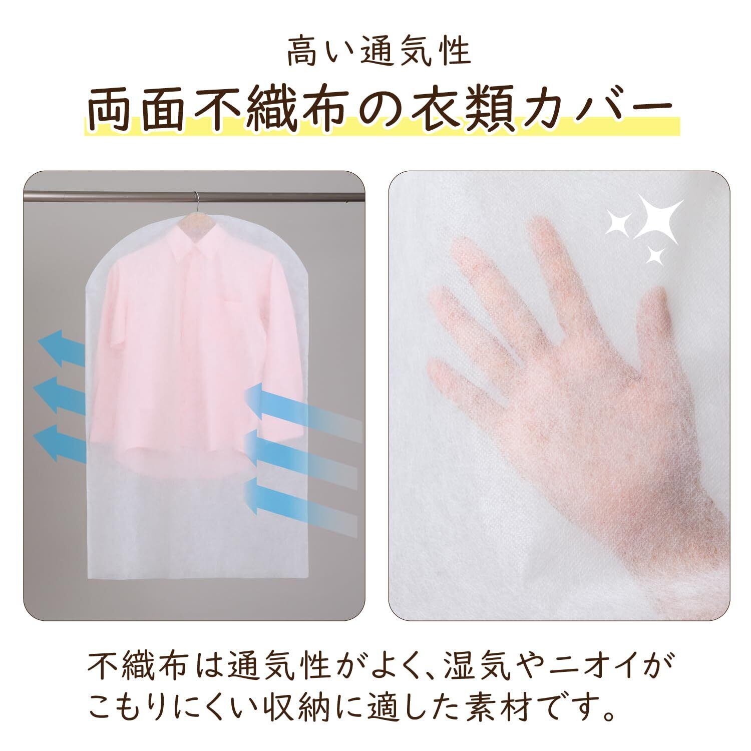 【通気性の良い不織布製ショートサイズ衣類カバー】:通気性が良く湿気やにおいのこもりにくい、ショートサイズの不織布製衣類カバー。
