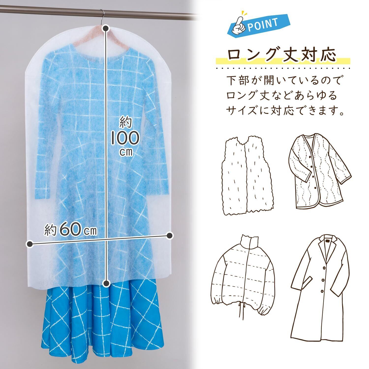 【洋服の毛玉や傷みを防ぐ・丈の長さを調節できる】:カバーを掛けておくことで保管中に洋服同士が擦れず、毛玉の発生や傷みを防げる。カバーの裾をハサミでカットすることもできるので、洋服の長さに合わせて使える。