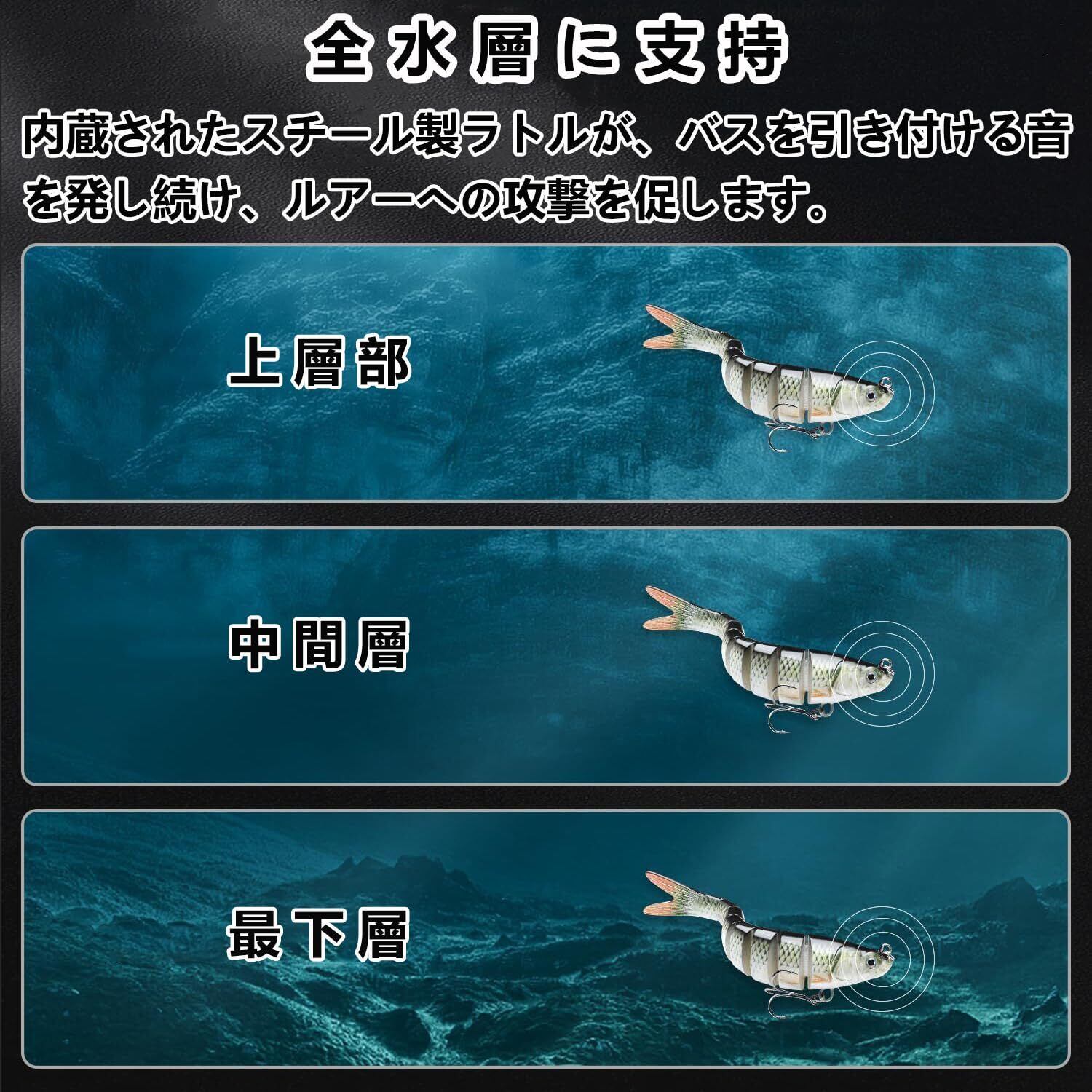 【高いシミュレーション】ABS素材で作られた本物に近い3D魚眼と光沢のある鱗を持つスイムベイトは、実際の魚の色や模様を巧みに再現します、外観からも本物の小魚ように生き生き見えます。ターゲットにしている魚も騙されてしまい、釣果が上がります。また、飛行時にジョイント部の可動域を制御する事は比較的簡単に出来ます。しかし、着水と同時に可動域が復元される。