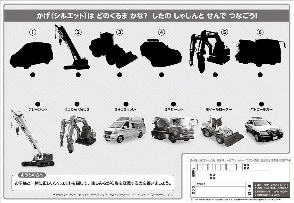 パトカーや消防車など、19種類の自動車が掲載されたパズルです。