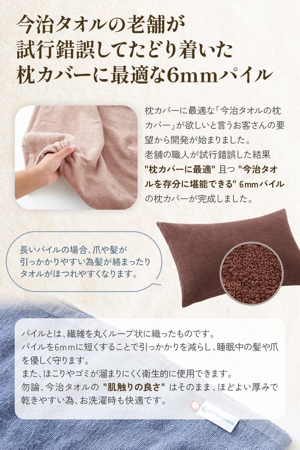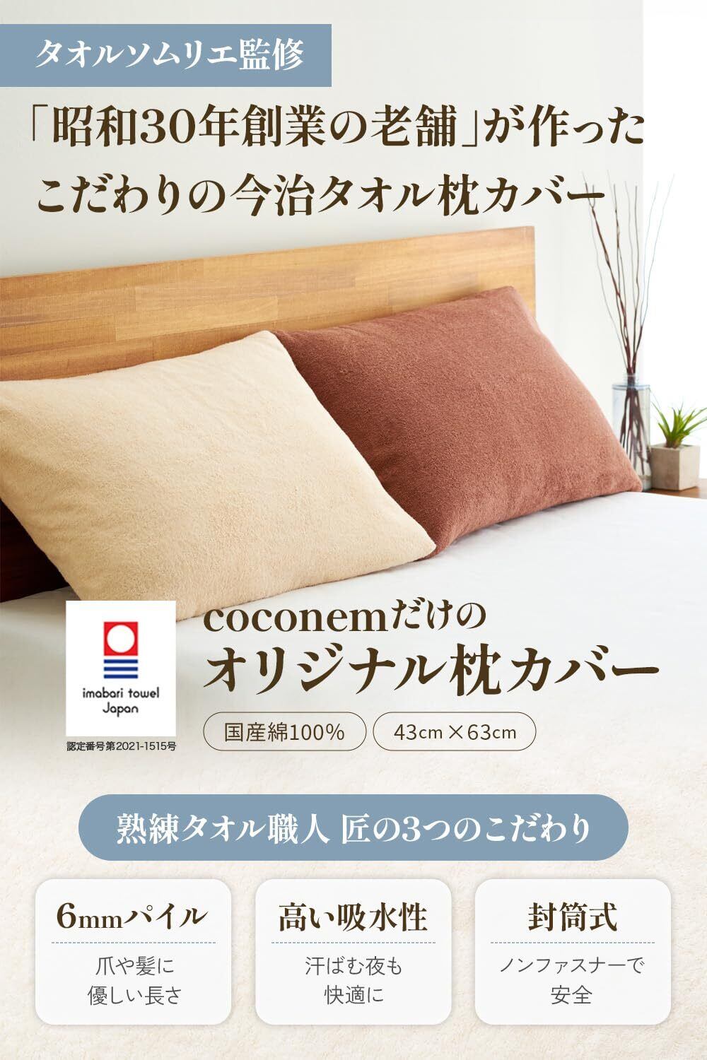 「昭和30年創業の老舗」が作ったオリジナル「今治タオル枕カバー」 国産 綿100% 封筒型 タオル地 パイル地 43x63cm coconem (アイボリー)