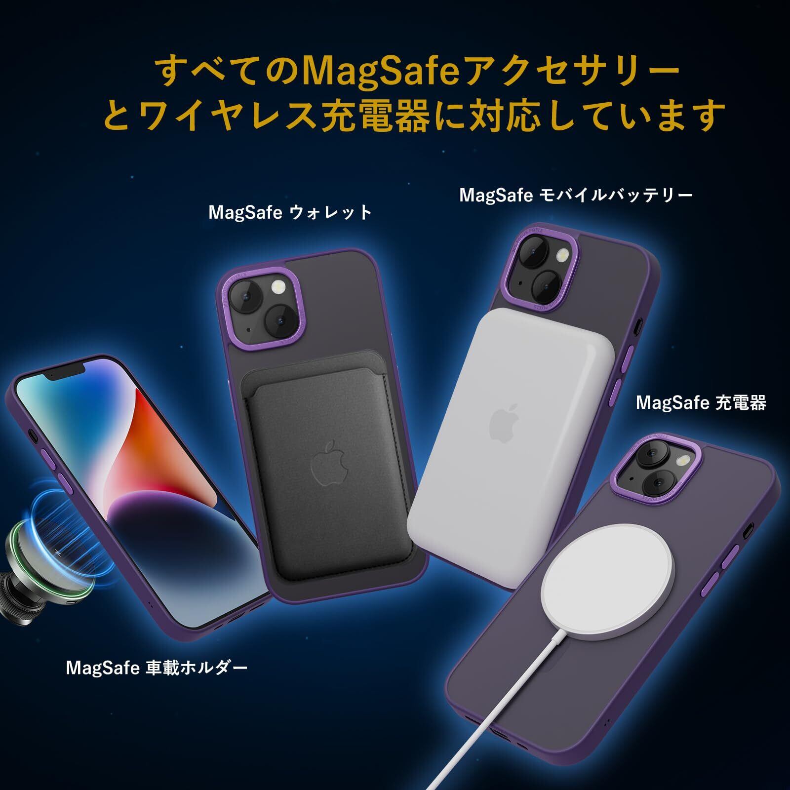 【米軍MIL規格・Magsafe対応】iPhone 14 Plus 用 ケース 半透明 マグネット搭載 耐衝撃 黄変防止 耐久性 磁力強い 高速充電速度 ワイヤレス充電 磁気スマホケース (パープル)