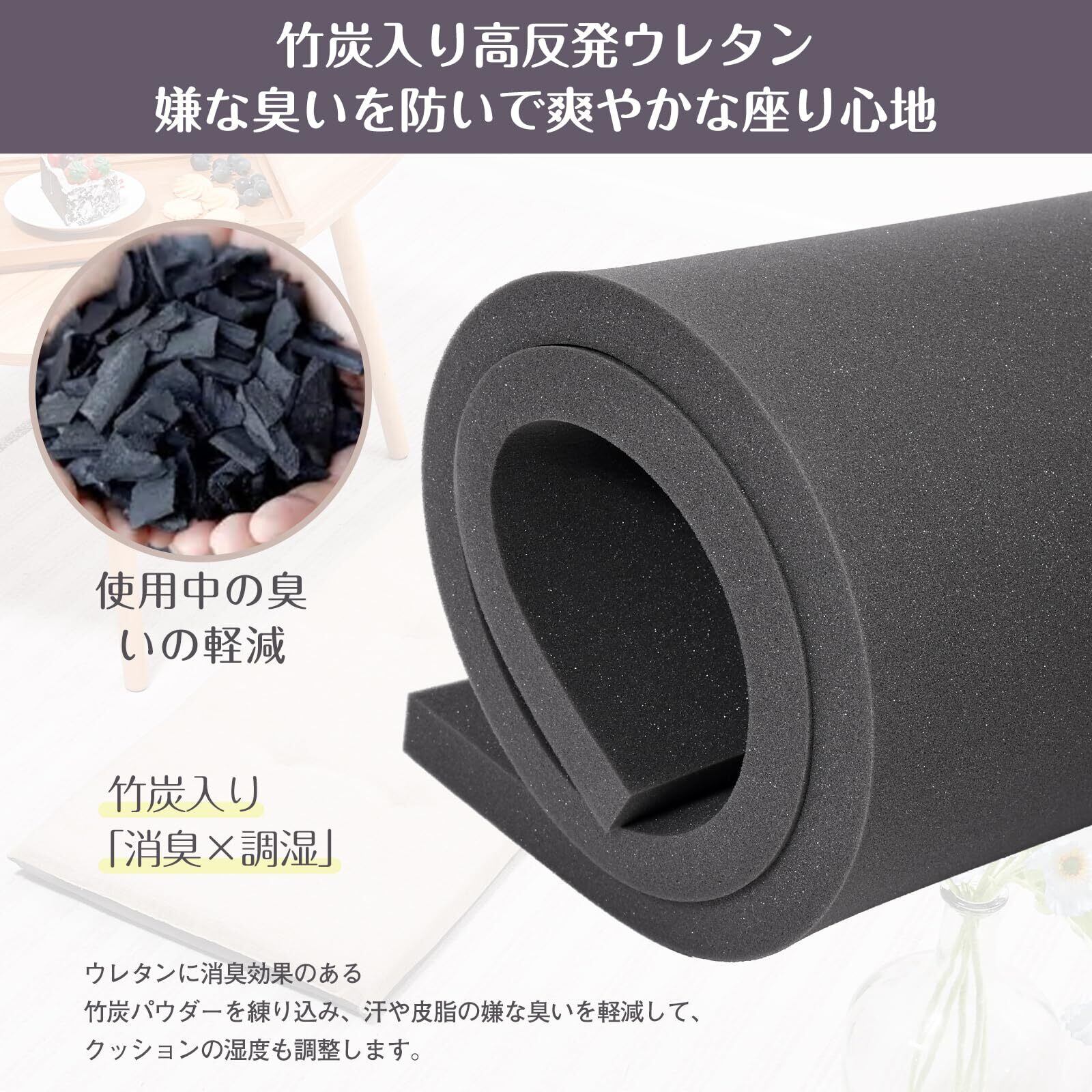 【竹炭入り: 消臭×調湿】高反発ウレタンフォームに厳選された竹炭パウダーを練り込み、汗の嫌な臭いと湿気を吸収、軽減します、いつでも座布団の清潔を保つことができます。