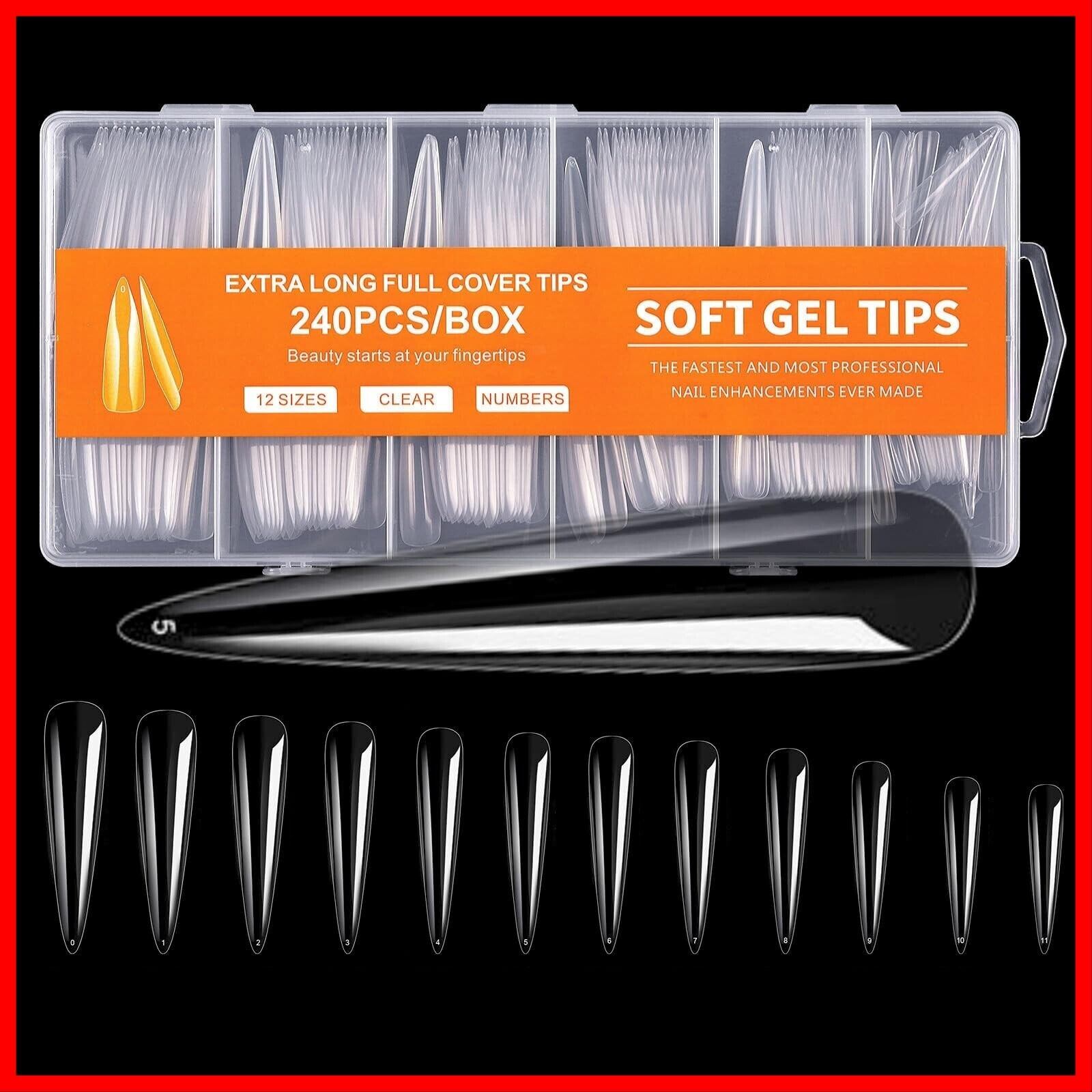 ネイルチップ スーパーロング 12サイズ 240pcs 長くて美しいネイルを楽しめるスーパーロングタイプ。形状はオーバル、ポイント、バレリーナ、スクエアオフ、スクエアからお選びいただけます。
