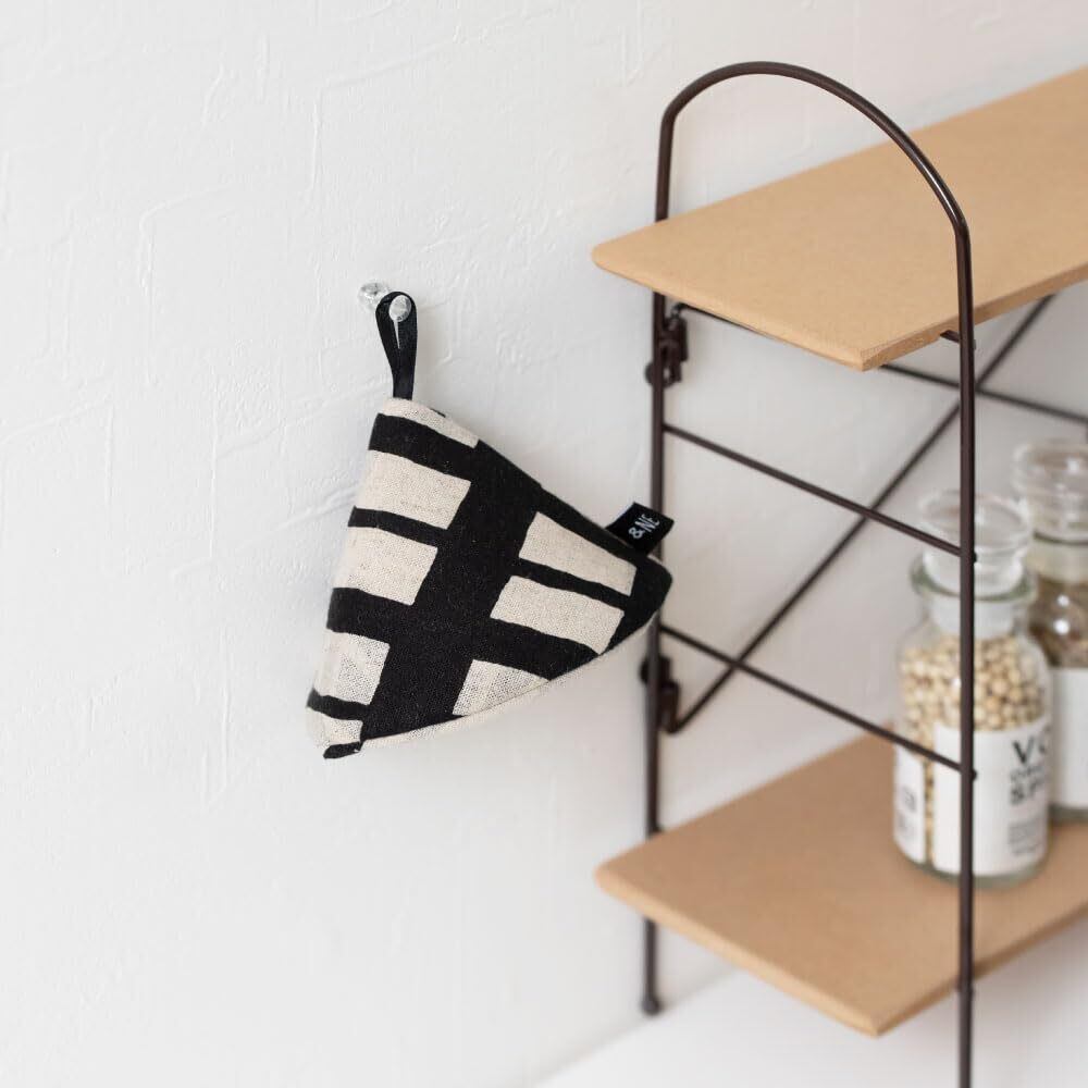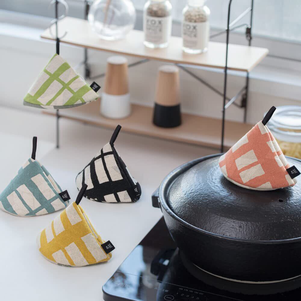 ころんとした三角形が鍋の蓋や取っ手にピッタリはまり、機能性も抜群。ふんわりとした触り心地です。紐つきなので壁につるしておくことでキッチンを彩り、お料理の時間を楽しく毎日の気分を上げてくれます。