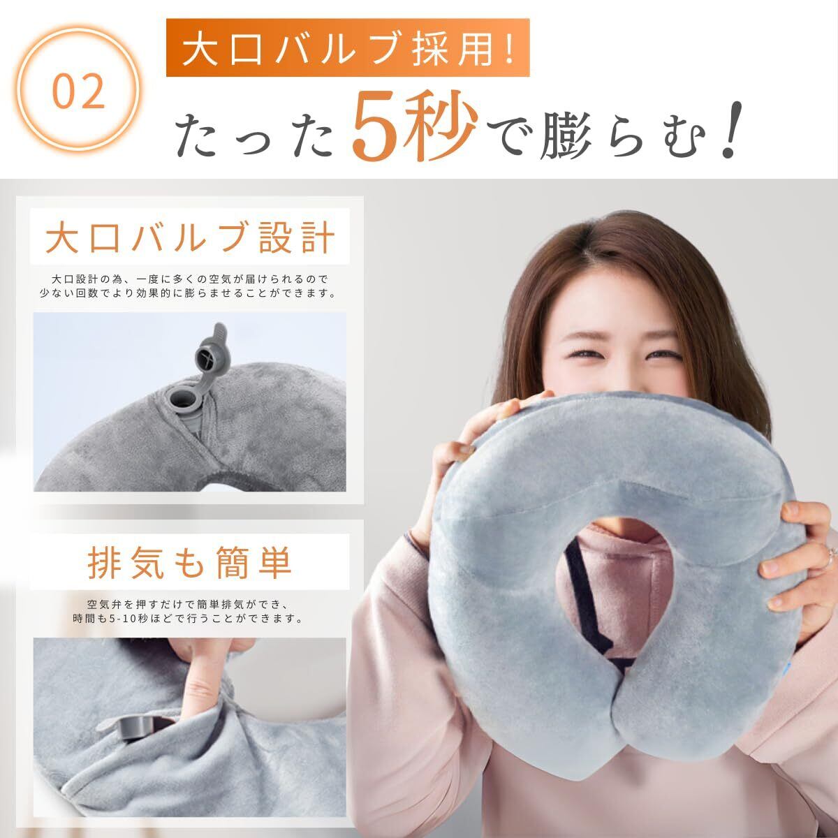 【使い方簡単】一般的な空気穴とは異なり大口の空気穴で、女性でも約2~3回の呼吸で膨らますことが可能です。ポンプで空気を吹き込む他社の製品と異なりポンプ破損の心配がなく、首周りにポンプや排気口がないためどのような形でも睡眠が快適です。空気の調整も可能なのでお好みの硬さで腰のサポートとしてもお使いいただけます。
