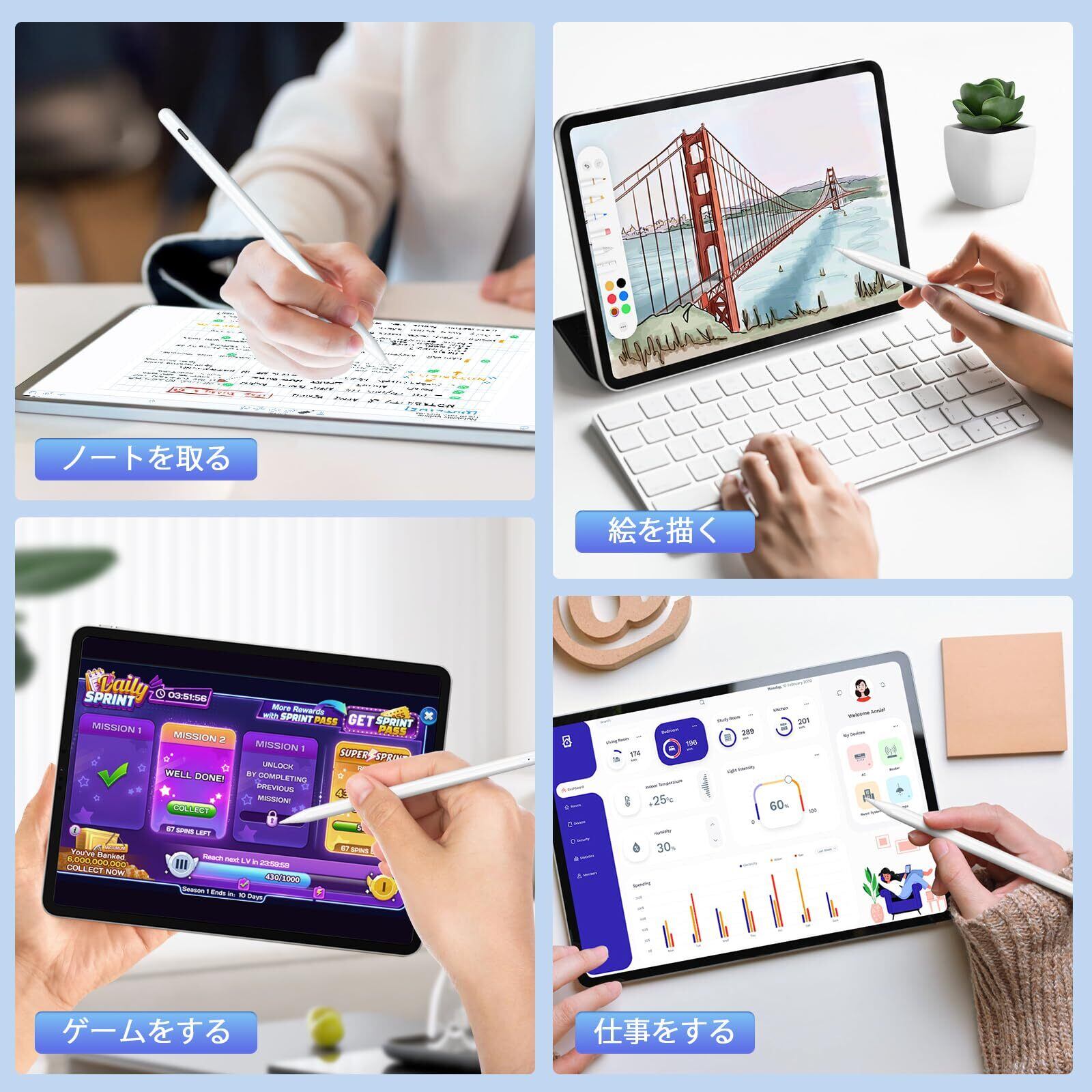 【パームリジェクション&チルト感度】iPad用スタイラスペンは、パームリジェクションとチルト感度を備えており、より快適で自然な書き込みや描画体験を提供します。パームリジェクションにより、画面に手のひらを置いても誤タッチや干渉が起こりません。チルト感度により、スタイラスを異なる角度で傾けることで、線の太さやシェーディングのバリエーションを正確に制御できます。