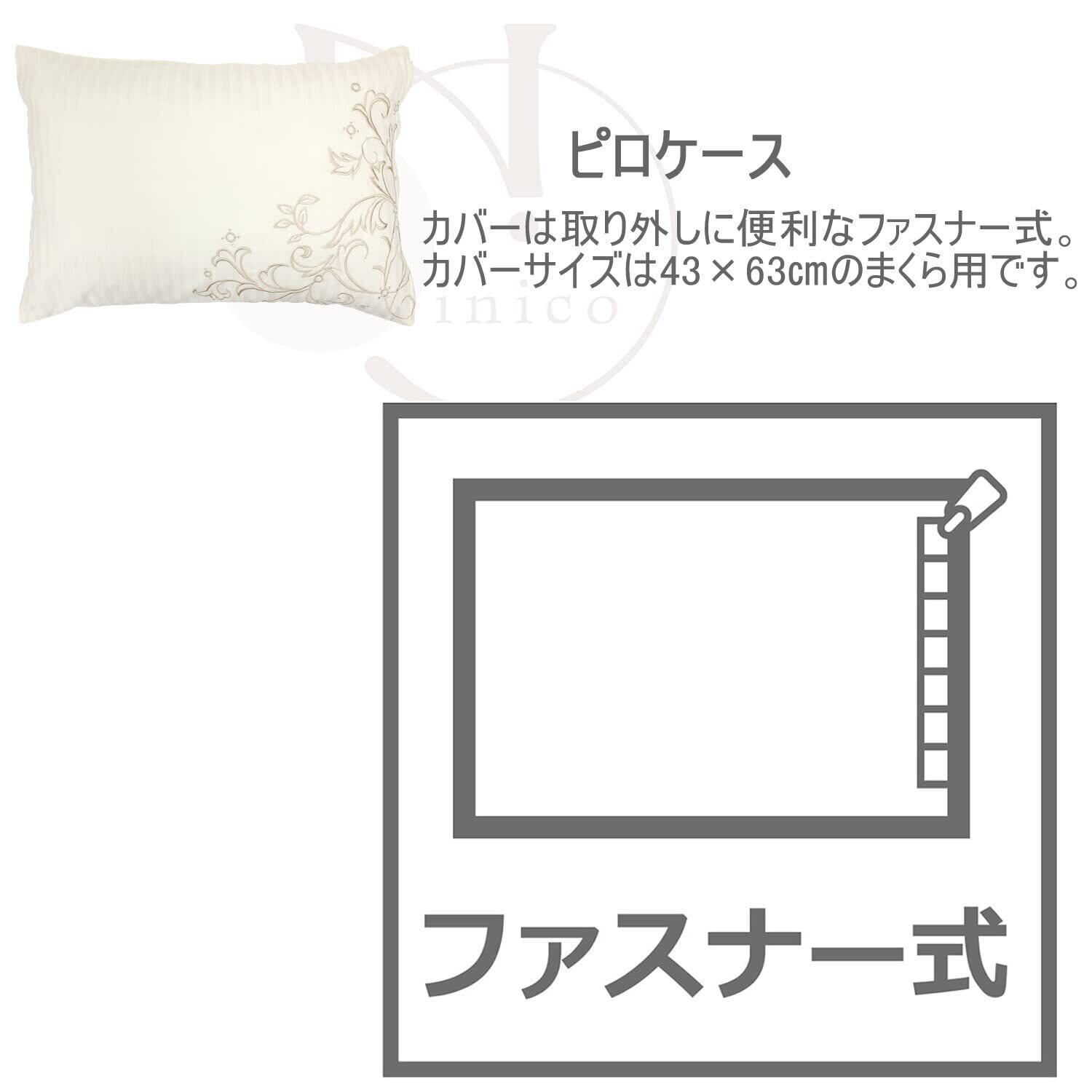 メリーナイト 枕カバー inico (イニコ) 「クレール」 アイボリー 約43×63cm ファスナー式 まくらが入れやすい 綿100% サテン織ストライプ 刺繍入り 上品な光沢感 洗える IN61551-07