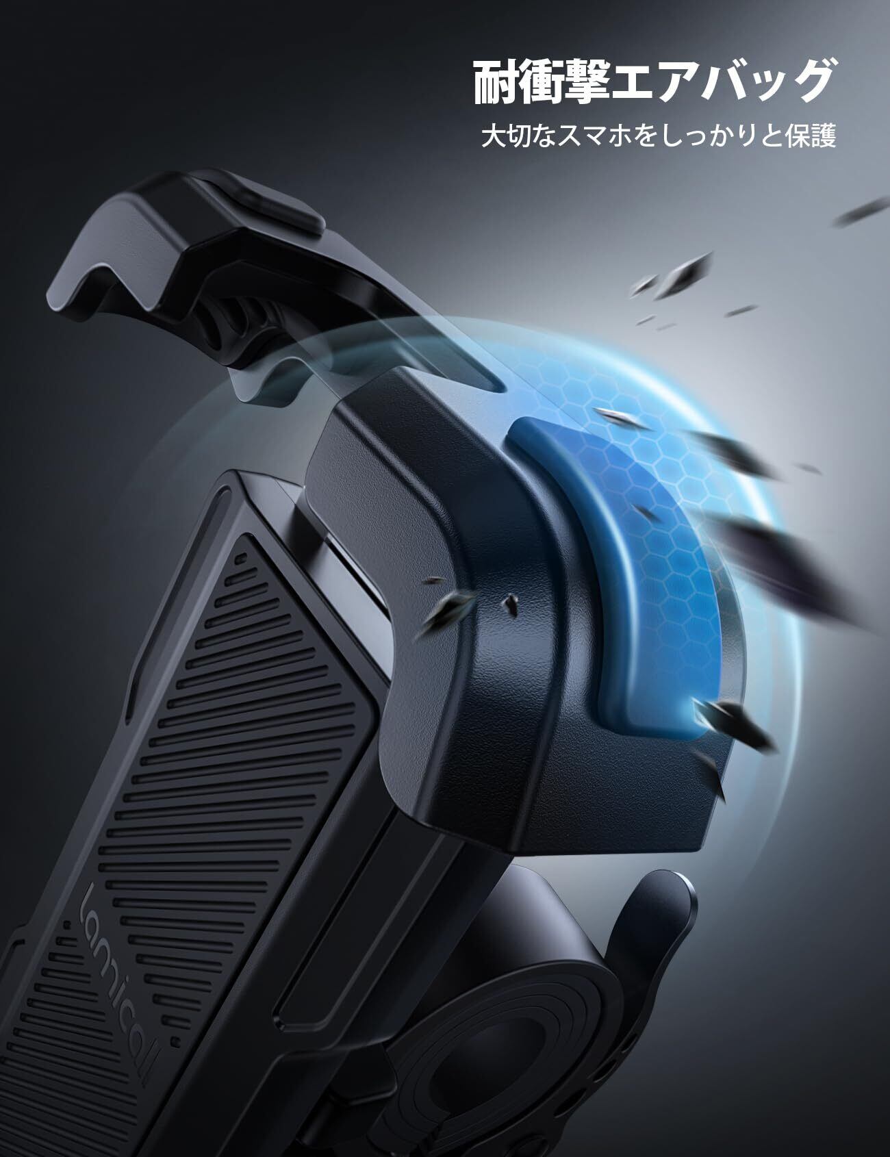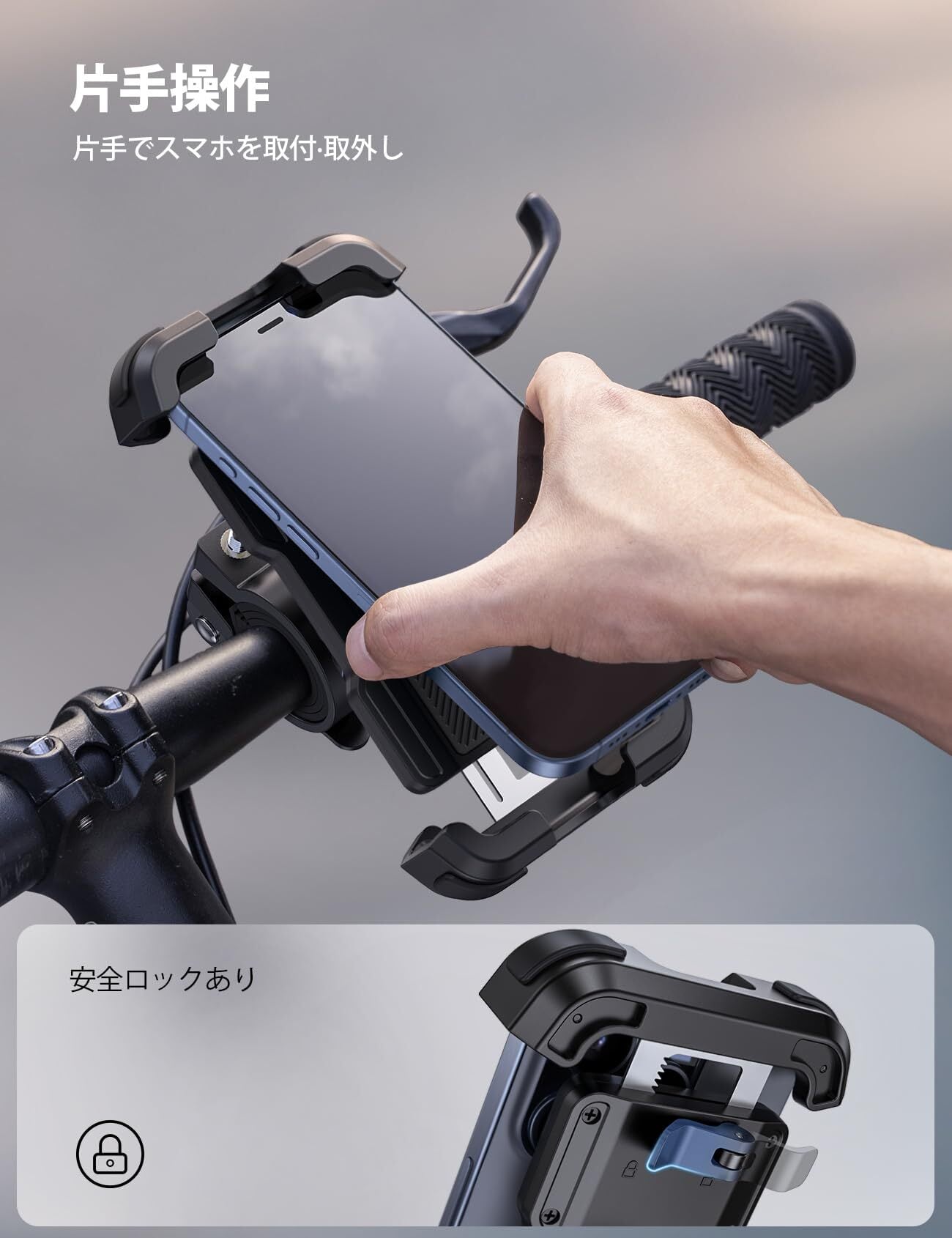 【落下防止ロック】使い勝手がよいロックが設置され、強い振動でもスマホをしっかりホールドできます。また、スマホの四隅のかわりに、スマホをオールカバーするデザインは、スマートフォンをガッチリと固定できます。