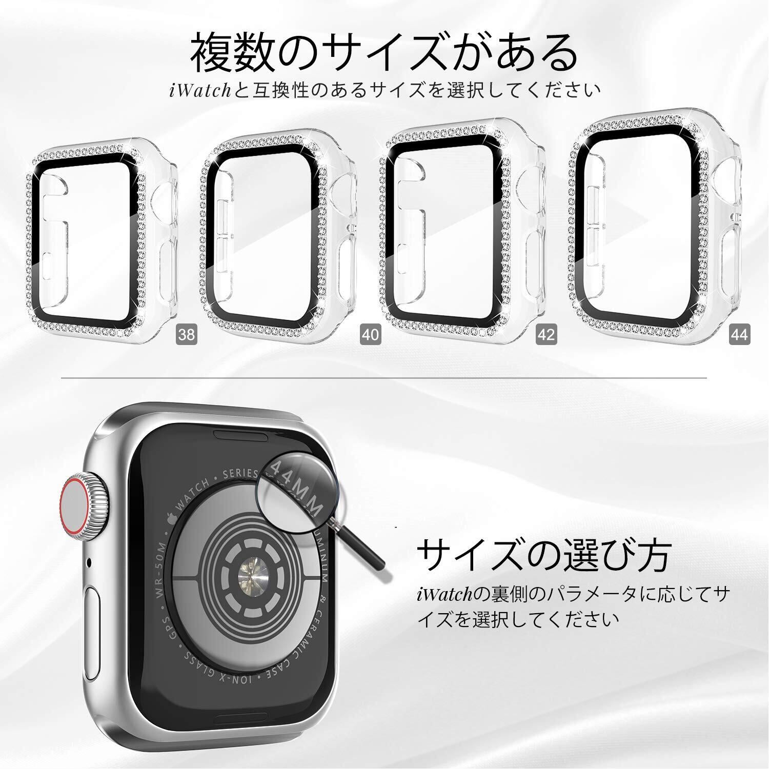 「WASPO AppleWatch ダイヤ付き保護ケース」とは、Apple Watchシリーズ10の42/46mm、シリーズ9/8/7の41/45mm、シリーズ6/5/4/SEの40/44mm、シリーズ3/2/1の38/42mm,、女性専用に設計されて、スクリーンプロテクター(強化ガラスフィルム)付きのAppleWatchラインストーン式保護ケース。