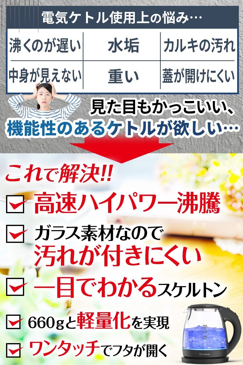 【✨改良版高機能ガラス製ケトル✨】内蓋をステンレスにし、さらに清潔感アップいたしました。お湯が沸くまでわずか95秒(※150ml・水温25度の場合)!忙しい朝やすぐにコーヒー・紅茶が飲みたいとき、あっという間にお湯が沸きます。赤ちゃん用ミルクの調乳やお料理など、様々なシーンでご使用いただけます。 さらにガラス製なので、においや味がお湯に移りにくく、水垢やカルキが付く心配がないので清潔を保てます。 Latunaの電気ケトルは、沸騰時にLEDライトが点灯するスタイリッシュな最先端電気ケトルです。 サイズ:高さ18cm×幅21cm×奥行12cm 重さ:約660g コードの長さ:1.3m 消費電力:1000W 容量:1リットル 材質:耐熱強化ガラス、ポリプロピレン(持ち手)