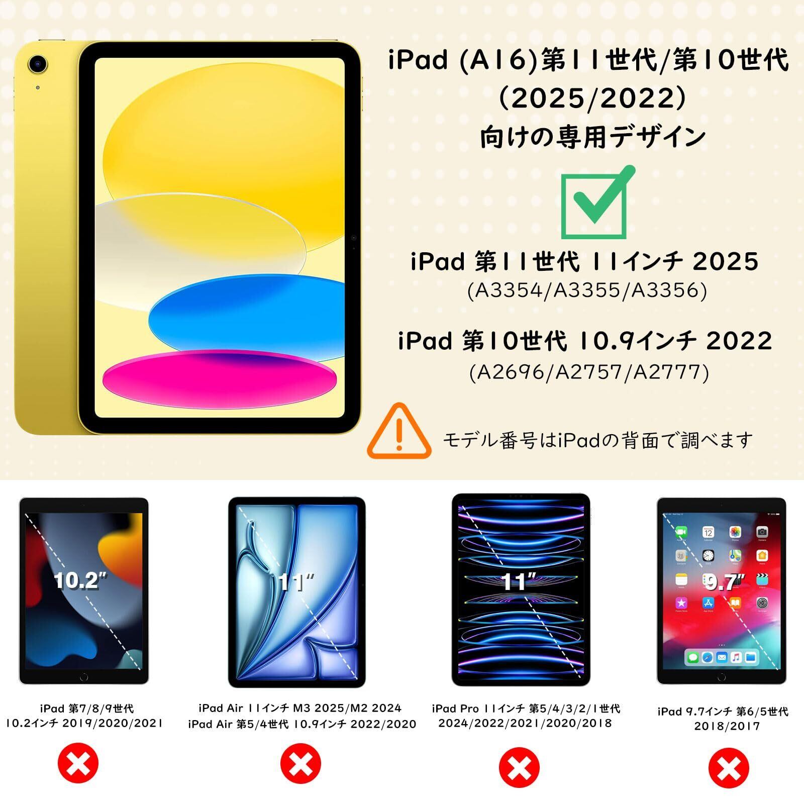 「対応機種」 2025年新発売のNew iPad(A16) 11インチ 第11世代(モデル番号:A3354/A3355/A3356)及び2022年発売のiPad 10.9インチ 第10世代(モデル番号:A2696/A2757/A2777)にカスタム設計しており、iPad Air 11 第7/6世代(×)、iPad Air 10.9 第5/4世代(×)、又は他のモデルには適用しません。購入する前にタブレットの機種/モデル番号を確認してください。