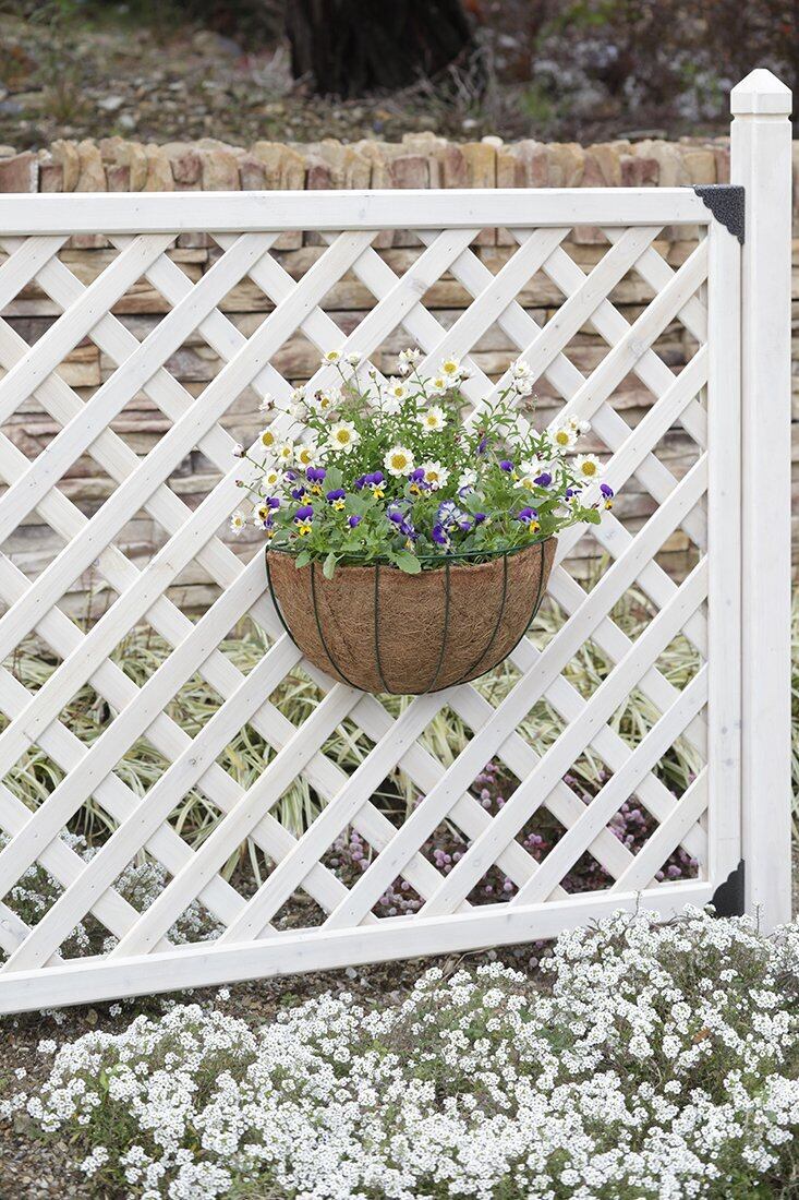 壁掛けタイプのハンギングバスケット。ラティスなどに掛けて、植物を立体的に飾れるアイテムです。
