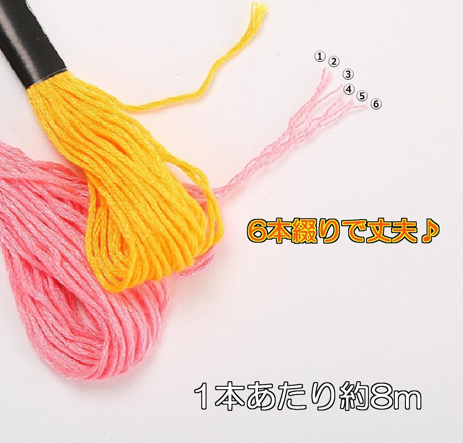【サイズ】各刺しゅう糸の長さは約8m/束。2本の細い糸が6本絡み合っている為、丈夫で切れにくくなっております。
