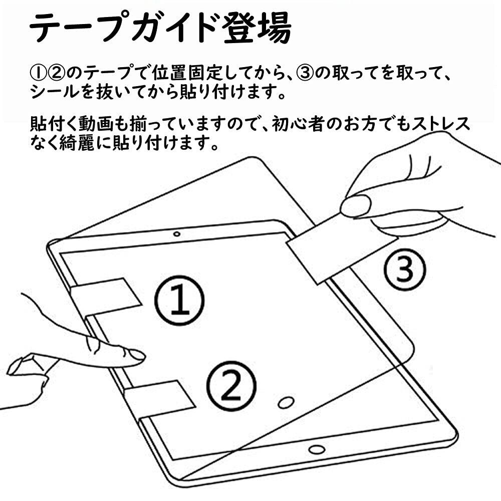 【対応機種】:iPad 10.2専用 iPad 10.2 ( 第9世代 2021 /第8世代 2020 / 第7世代 2019 ) 【貼付け魔法ツール付きでホコリ残ずズレずに張り付ける】専用のガイドテープつき、貼付け手順動画で、初心者お方でもズレなく綺麗に貼り付けことができます。位置を決めてから保護シールを剥がし、ガラスフィルムを下に向いて貼り付くこととなりますので、ほこり残るリスクは著しく減少することができました。