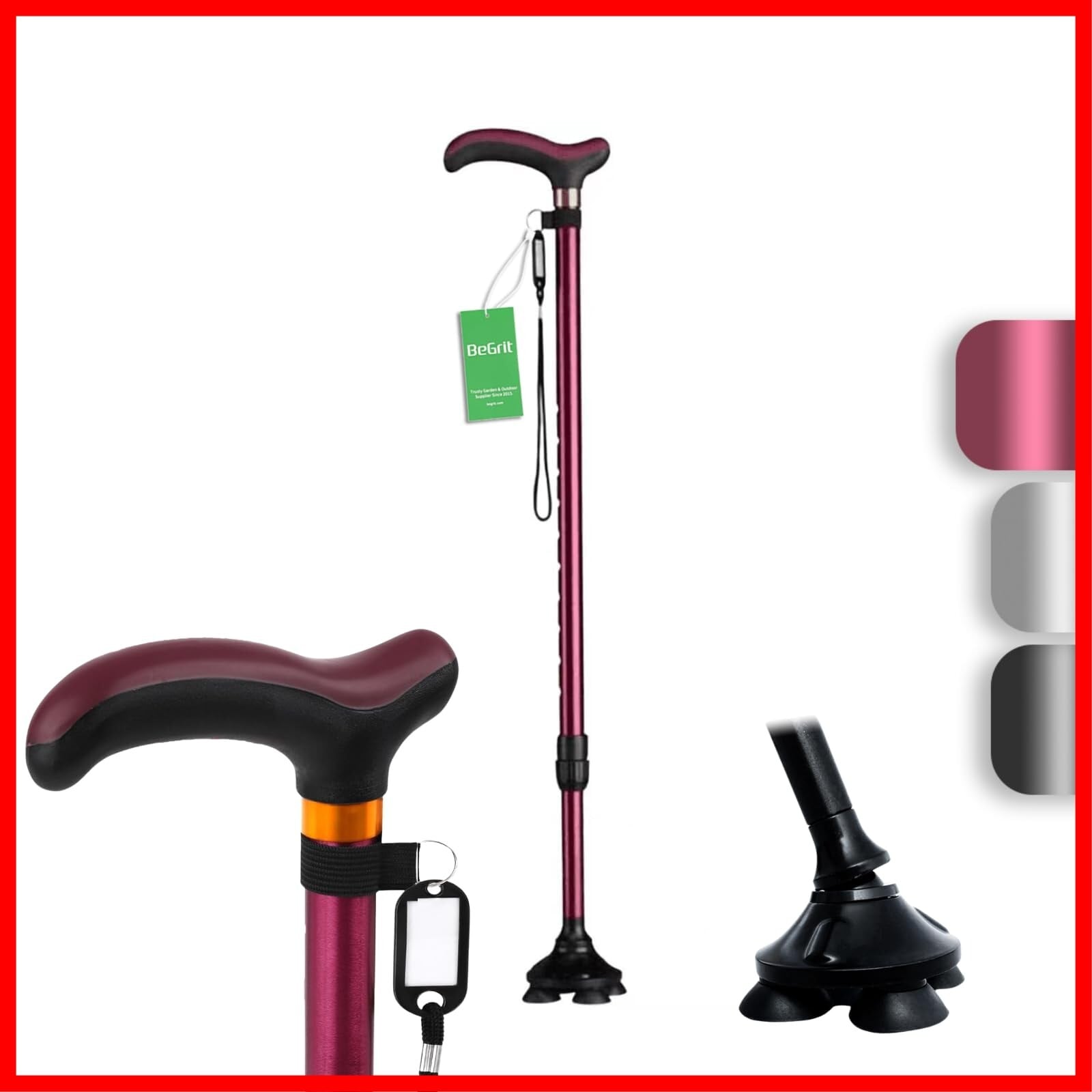 BeGrit 介護 杖:杖のハンドルは人間工学に基づいて設計されており、非常に快適な手触りで、手の疲労を軽減し、筋肉の痙攣を防ぎます。正しい姿勢を維持し、特に手首、肩、背中の負担を軽減するのに役立ちます。迷子防止ネームタグ付きのリストストラップは、杖の滑り落ちを防ぐだけでなく、杖に名前と電話番号を記入することもできます。安全で信頼できます。