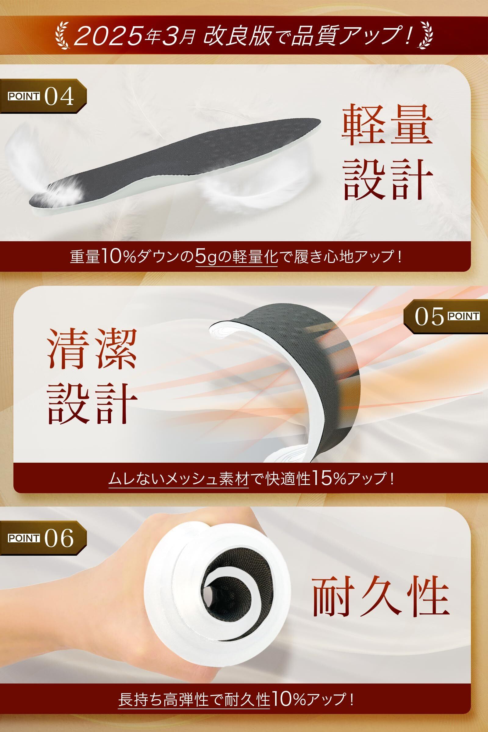 【改良版】入れるだけで真っすぐ脚に!お客様の声を元に、①高低差10mmですっきり美脚成功率8%UP、②足裏刺激突起で足先活性化力10%UP、③アーチサポートのサポート力15%UP、④軽量設計で重量10%DOWN、⑤清潔設計で快適性15%UP、⑥耐久設計で耐久性10%UP、に大改良しました。