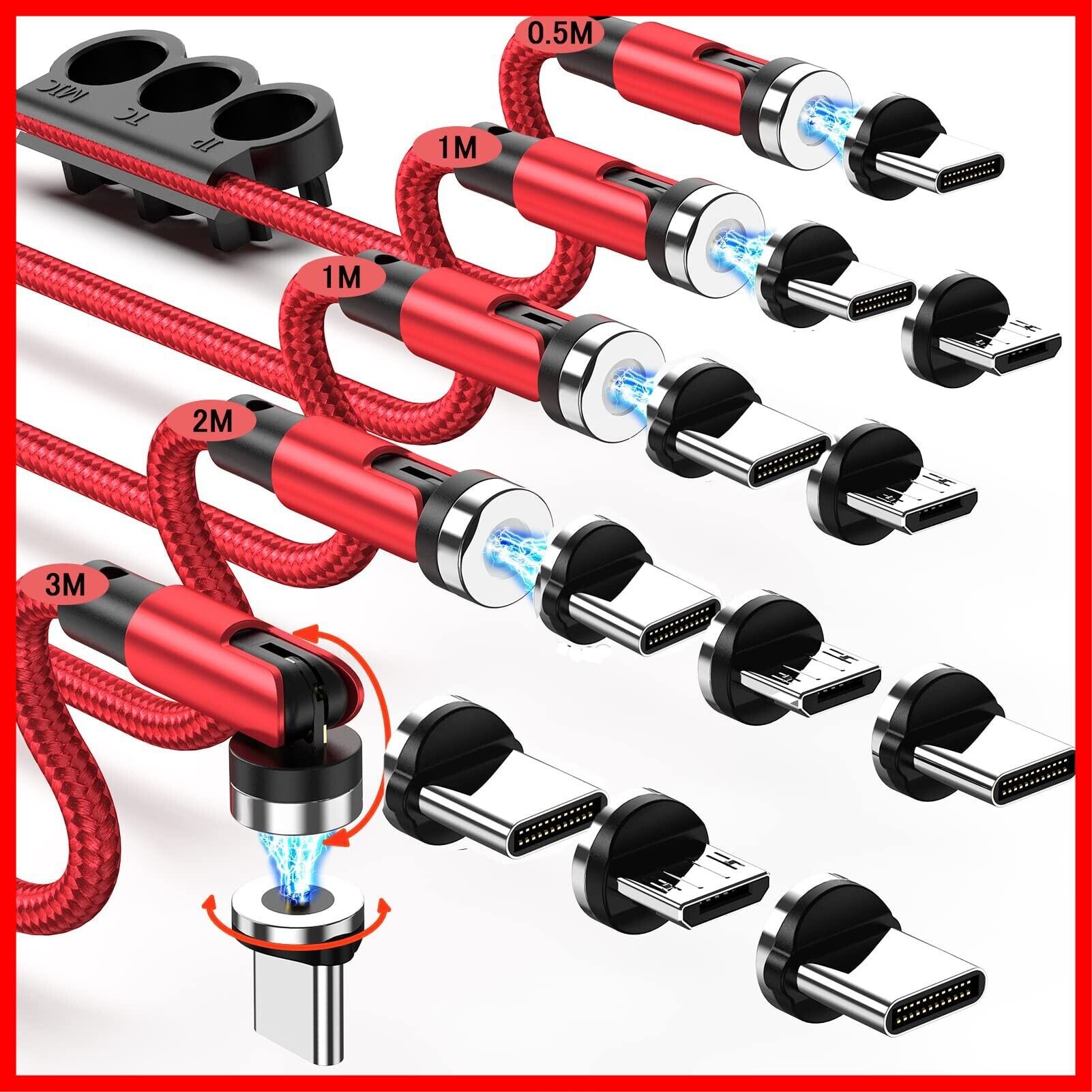 マグネット 充電ケーブル 【5本セット/0.5+1Mx2+2M+3M&12コネクタ】 LEDライト内蔵 USBケーブル 3in1 充電器 マグネット 540°回転可能 急速充電 防塵 USBC Micro USB Phone 全機種/PlayStation対応 レッド clenye