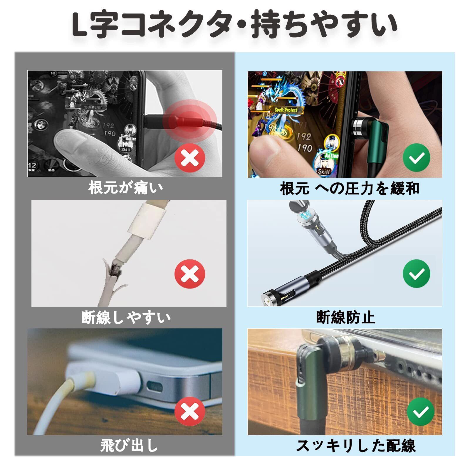 【540度回転式・より安全便利】180°+360°回転デザインで、コネクタ部分360度回転、ケーブル部分が180度首振り、マホゲームや動画鑑賞時、スマホの横向きや横置きはL字型がおすすめ!運転中、料理中、片手作業時、ぬきさし不要、近づけるだけ簡単に接続され、もっと安全になります。