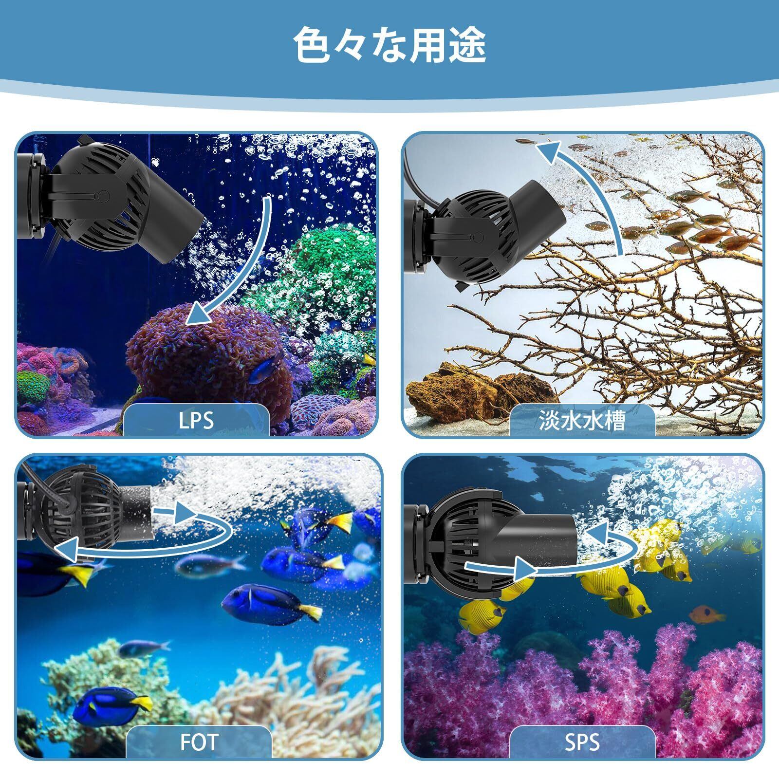 【水槽の水循環】このウェーブは川や海の自然な流れをシミュレートし、魚が泳ぐ水の動きを作り出します。 これにより、背の高い植物が流れるように動くことができ、水槽がより自然な外観になります。 上層水を撹拌して溶存酸素を増やし、魚、サンゴ、植物の成長を促します。