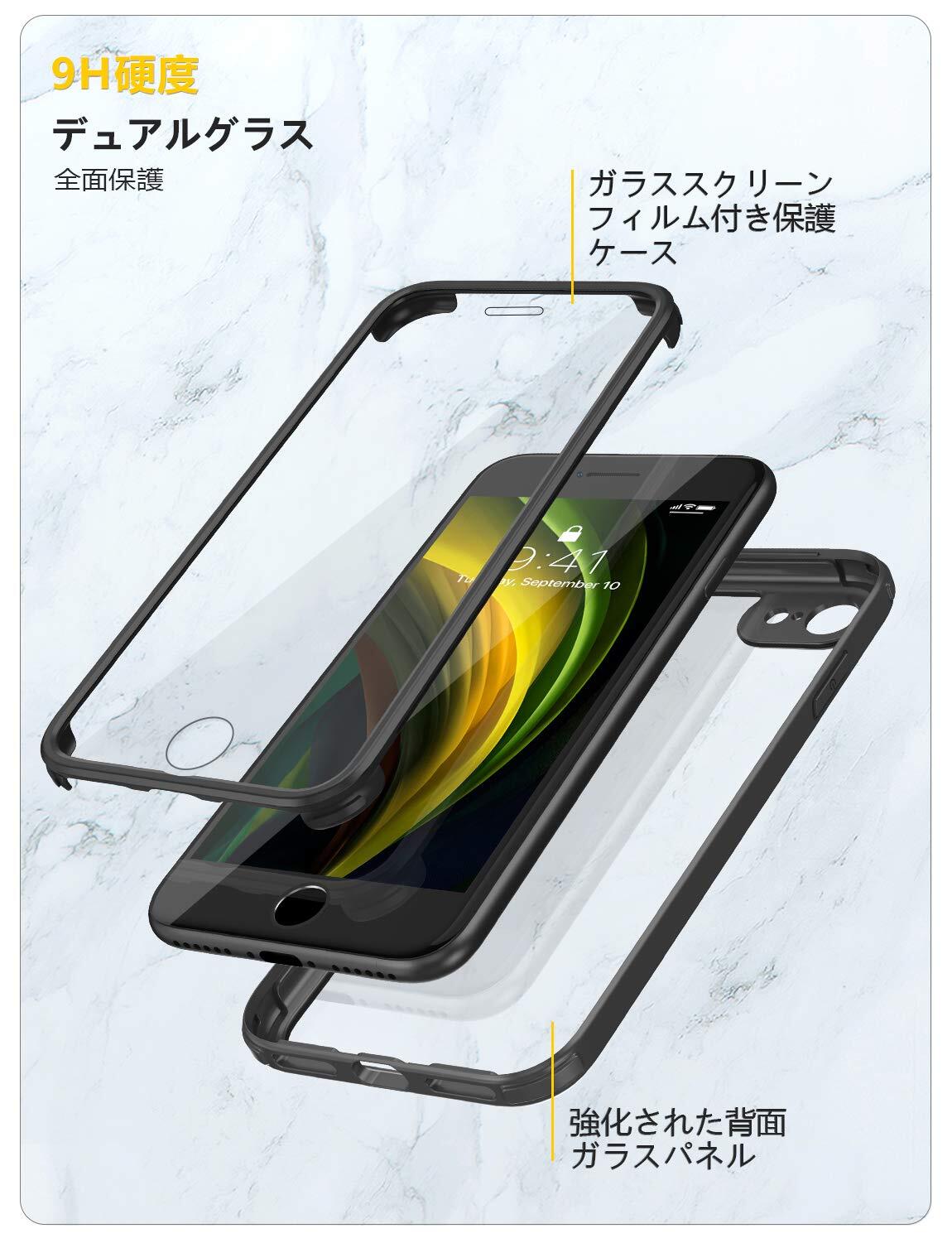 Miracase iPhoneSE用 ケース 第2世代 iPhoneSE2用ケース 第3世代 SE3 iPhone8用ケース 2020 9H強化ガラス 4.7インチ フルカバー 360°保護 黒