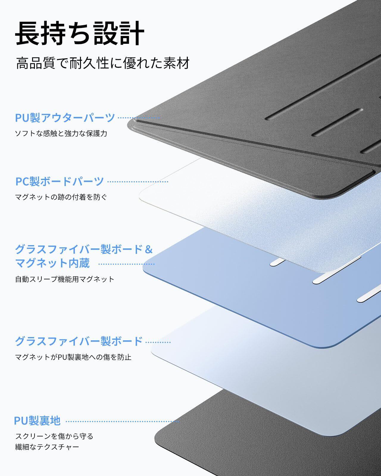 【マルチアングルデザイン】:2つのスタンドモードに対応しており、45°~60°はビデオ鑑賞、作業、FaceTimingなどに最適なビューイングモードへと、25°に調節した場合は執筆、絵画、その他のクリエイティブな作業に最適なライティングモードへと用途に合わせて角度調節が行えます
