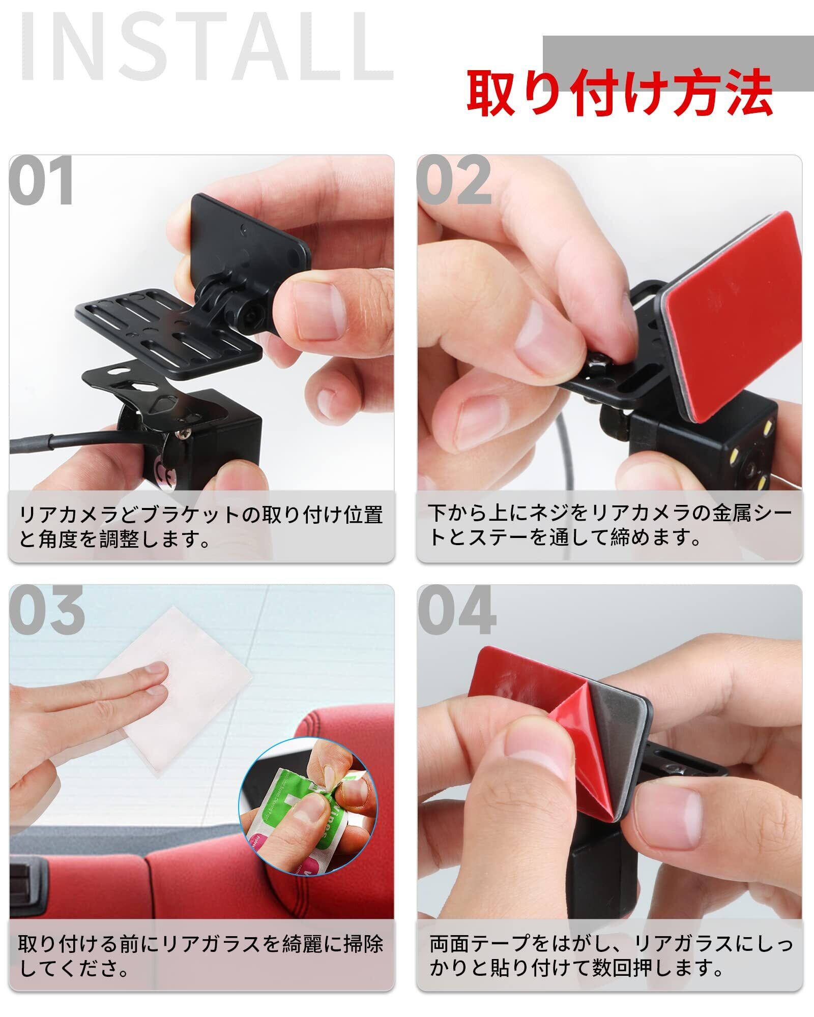 両面テープと取り付け工具付き:両面テープ付きのため、リアカメラをブラケットに固定した後、取り付けたい位置に貼り付けてください。角度を幅広く調整できます。