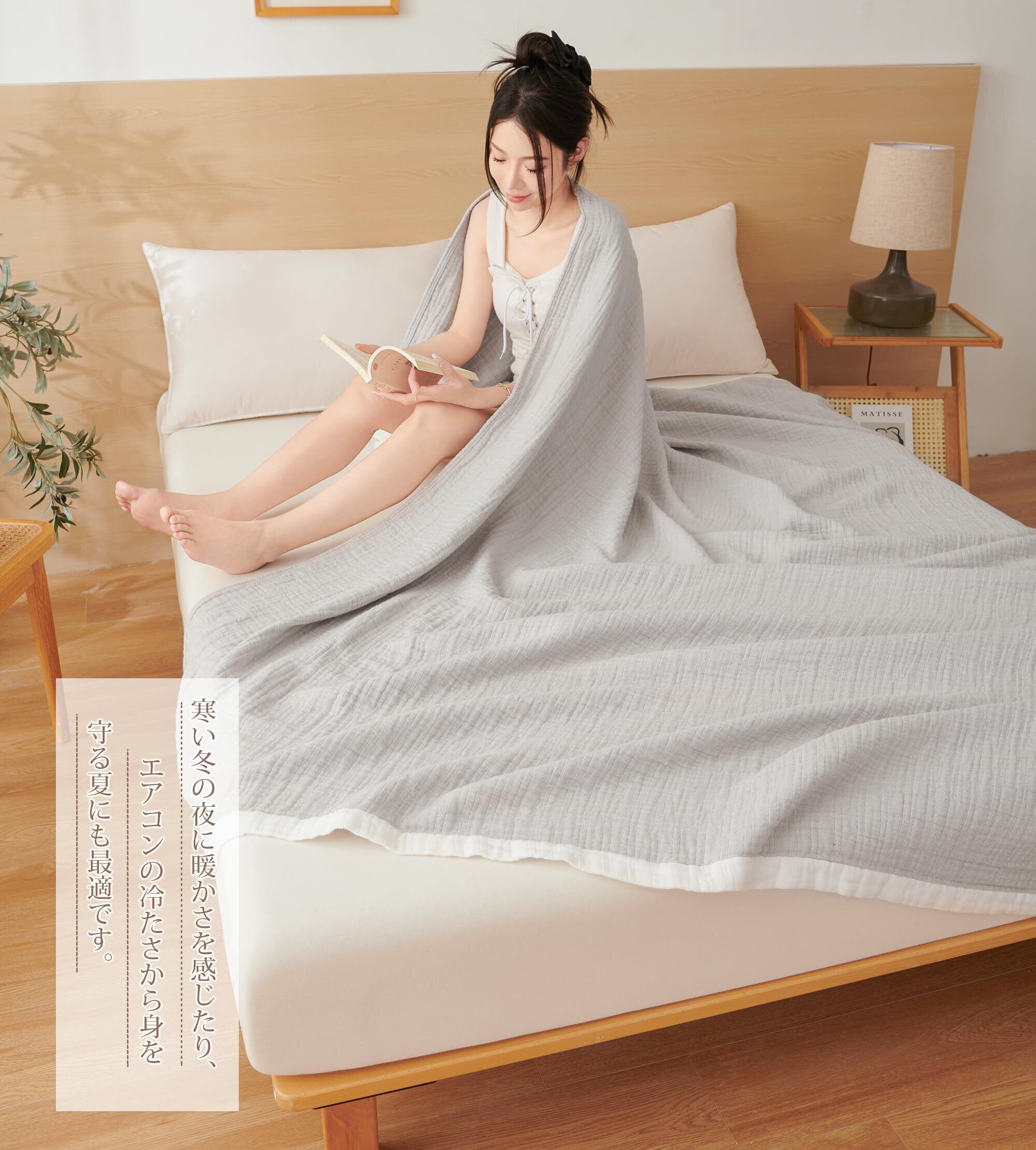 【ふかふかソフトな風合い】AYOは、睡眠にとって快適なガーゼケットがいかに重要であるかを深く理解しており、このブランケットを企画・製造しました。私たちは常にお客様に健康で高品質な製品を提供することに努め、「家の隅々に快適さをもたらす」ことを最も重要な使命としています。ぜひ本物のAYO製品をお選びいただき、暑い夏の日のひざ掛けや、ソファでくつろぐときのひざ掛けとしてもおすすめです。 幾重にも織り上げることで繊維の間に空気を溜め込み、体温を適度に保つので、冬には毛布の代わりとしても使えます。春夏はもちろん、秋冬も大活躍! 羽毛ふとんと一緒に使うインナーケットとして、またひざ掛けなどにも活用できます。幅広い活用方法!