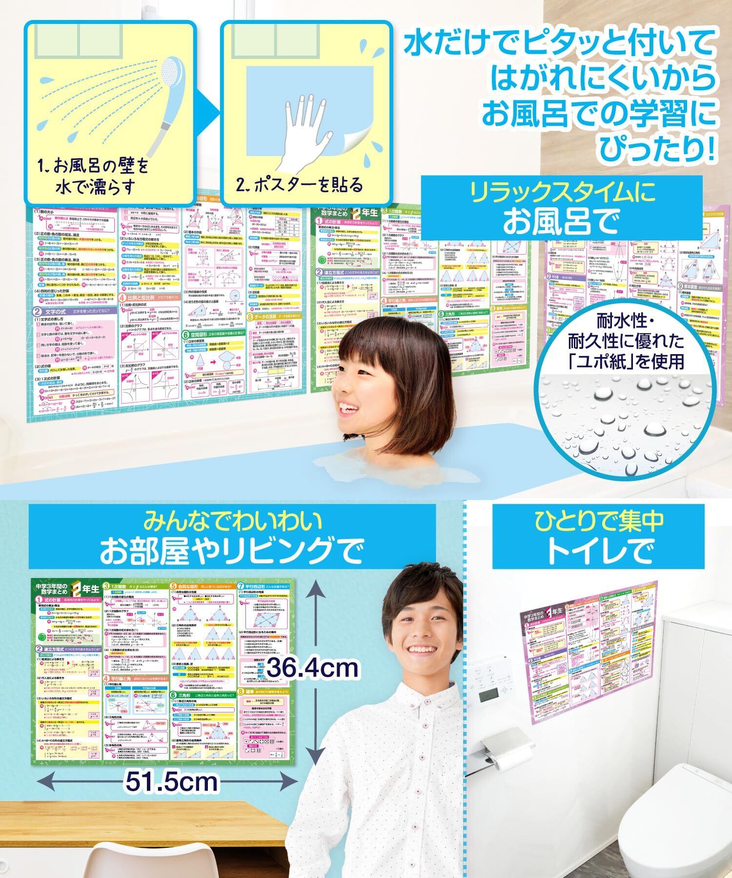 耐水性素材でお風呂でも使用可能:ポスターは耐水性の「ユポ紙」を使用しており、水だけで簡単に貼り付けることができます。これにより、お風呂場でも学習が可能で、バスタイムを有効活用して中学数学の習得ができます。耐久性が高く、長期間使用しても劣化しにくいです。