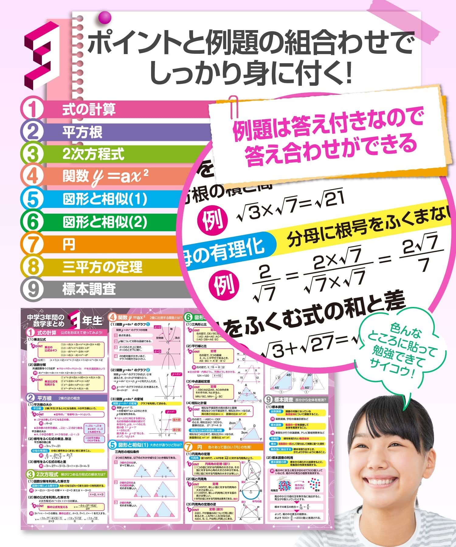復習に最適な設計:ポスターは家庭での復習用として最適に設計されており、学習内容をいつでも確認できるようになっています。部屋や勉強スペースに貼ることで、自然に数学の知識を復習できる環境が整えられます。特に試験前の確認や日常的な学習習慣の維持に役立ちます。