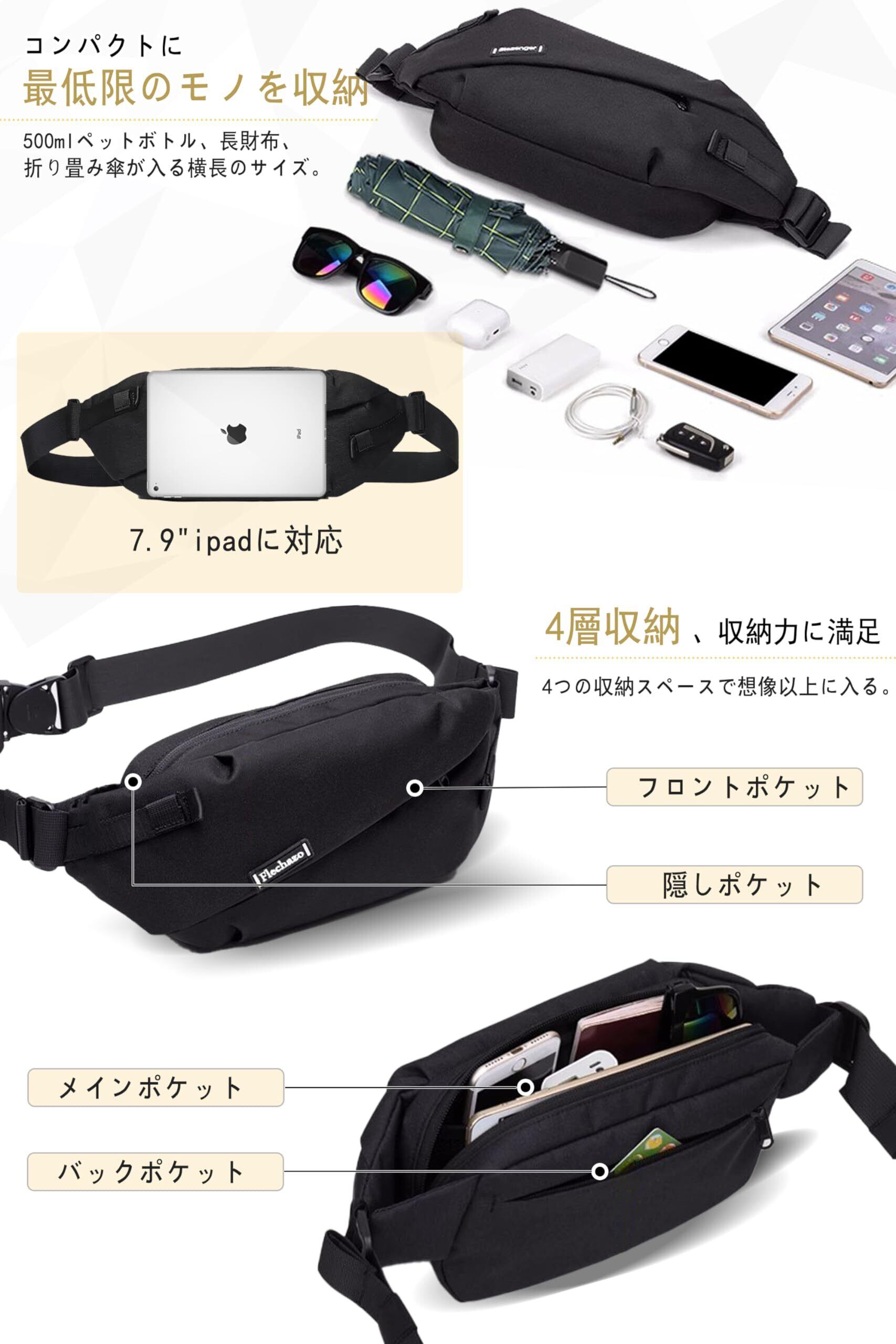 【ウェストポーチ、斜めがけバッグ 、肩掛けの3WAY着用が可能】ベルトには、自由調整が可能なベルトストッパー(アジャスター)機能を搭載。斜めがけバッグ 、肩掛け、ウェストポーチにもスマートに変化。メンズ、レディース 問わず快適なフィット感を実現。内側収納には、鍵の取り外し可能なキーストラップを内蔵。また、ペンを置く場所も増え、ビジネスマンにおすすめのボディバッグ。