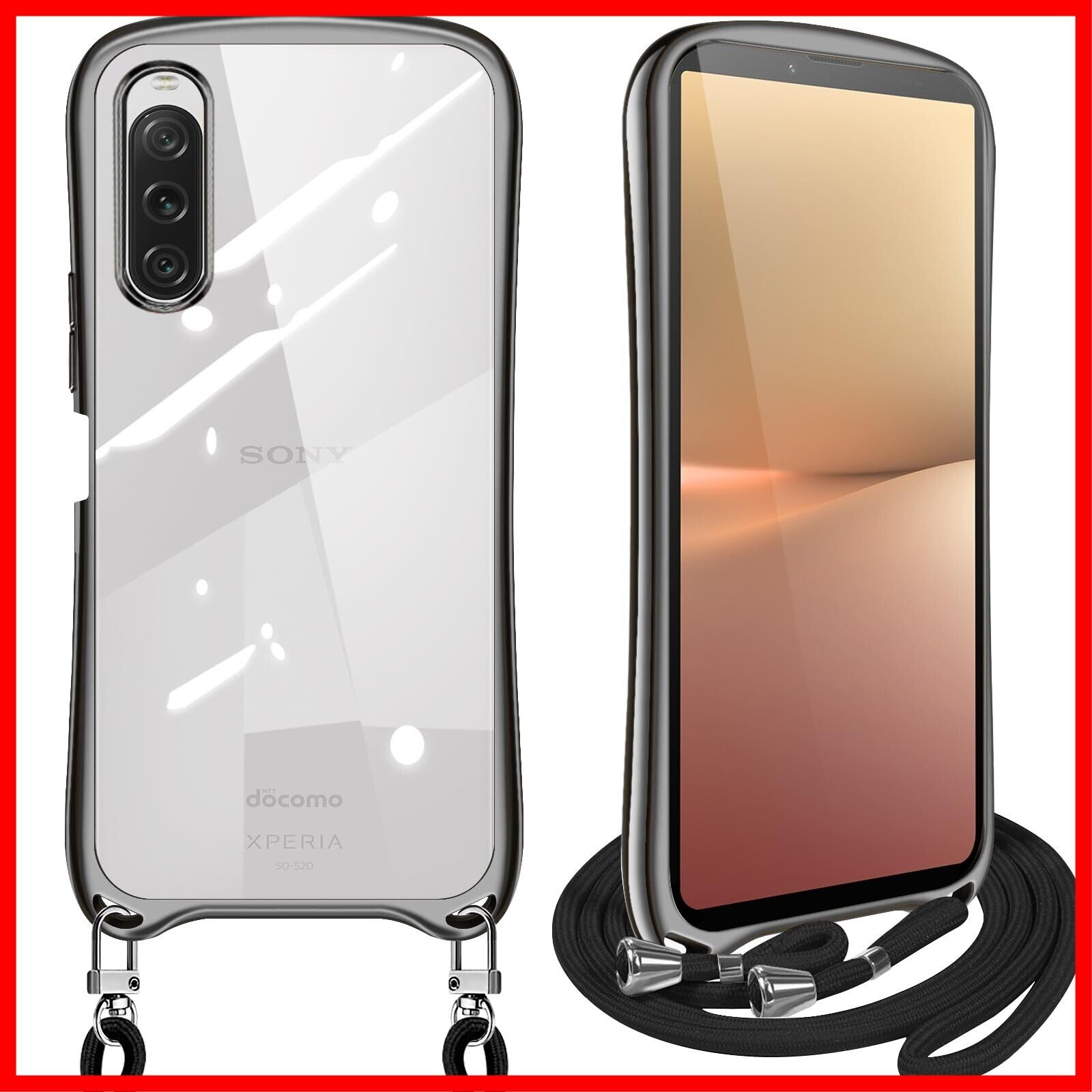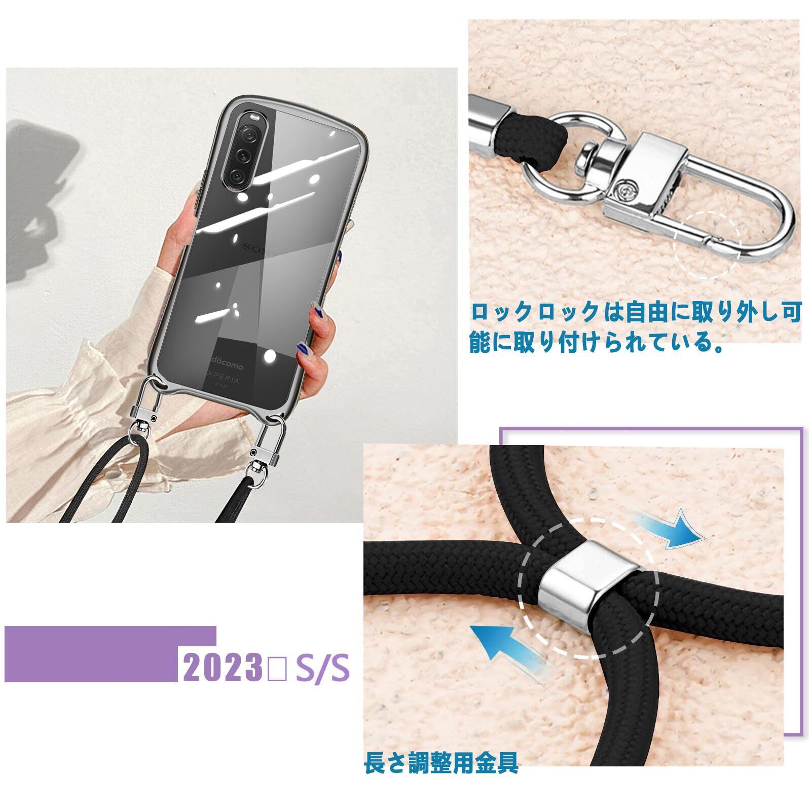 Xperia 10 V ケース ショルダー クリア SO-52D SOG11 エクスペリア10v スマホケース カバー 耐衝撃 透明 TPU ストラップ付き 肩掛け 首掛け 紐付き 斜めがけ シリコン メッキ加工 取り外し可能 長さ調整可能(ブラック)