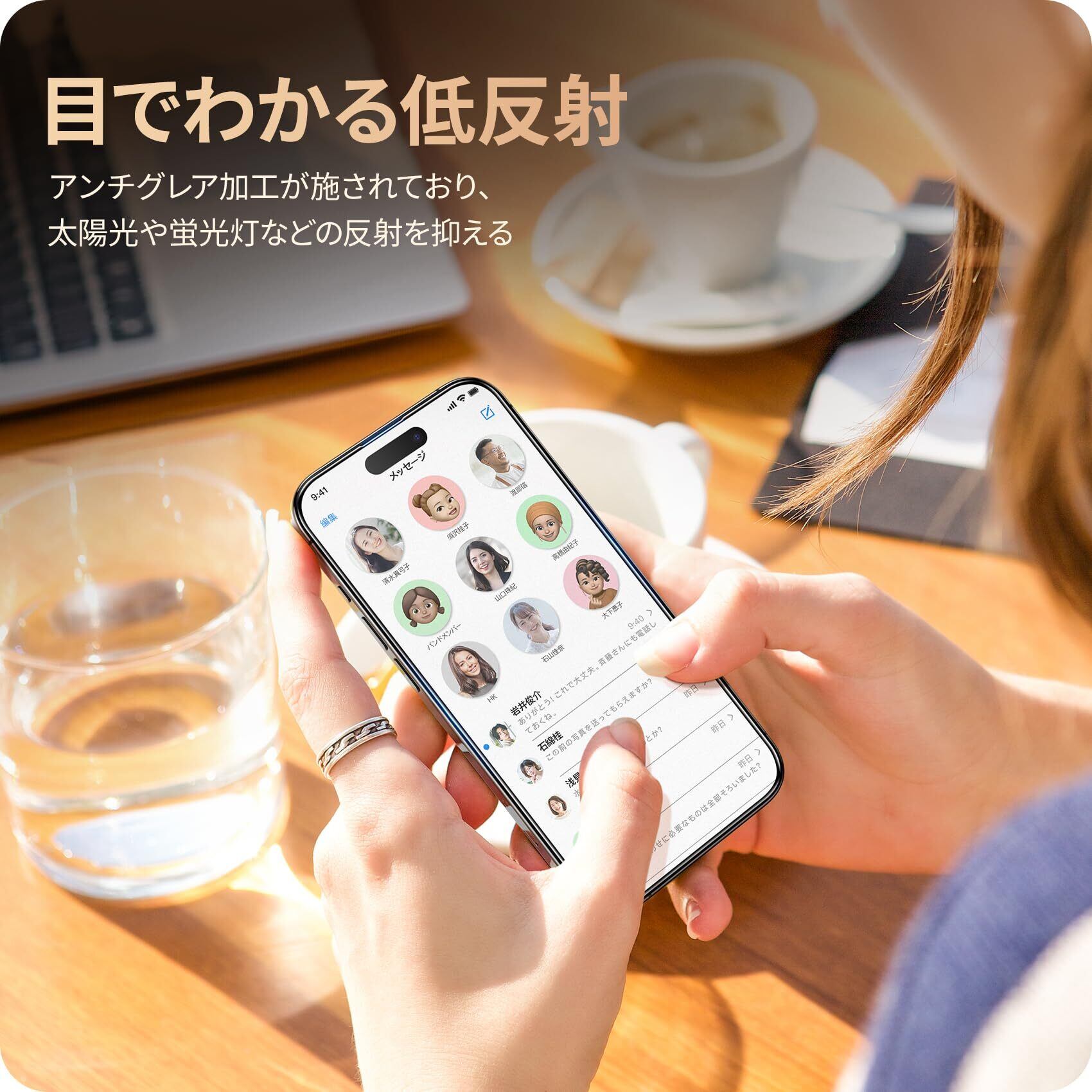 【黒縁全面保護・耐衝撃性アップ】黒縁取りでスマートフォンの画面をフルカバーして、落下や衝撃による損傷からスマートフォンを守ります。9H表面硬度ガラスを採用し、スマートフォンがカバンの中で、鍵などの鋭いものにぶつかっても傷が付きにくく、アイフォン 15 プロ マックス の画面をしっかり保護します!また、飛散防止加工により、万一割れてもガラス破片が飛び散ることなく安心です。