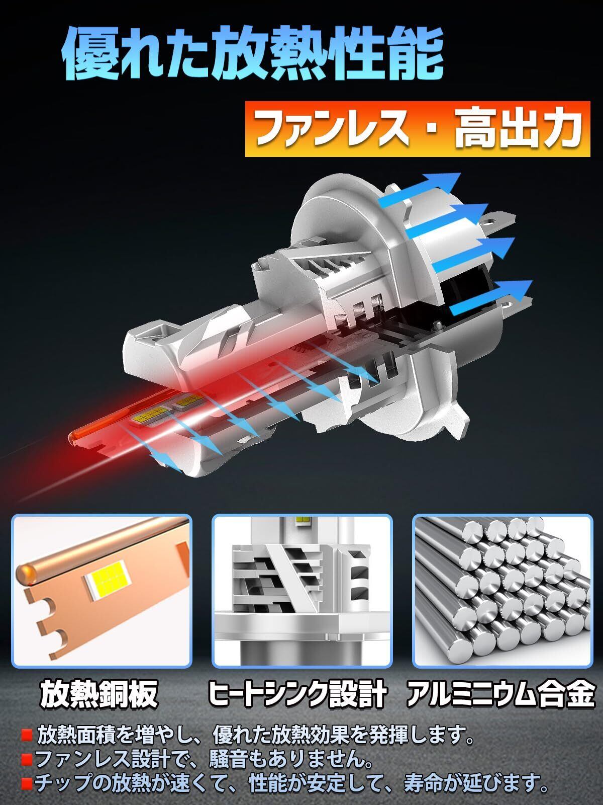 安定した性能・優れた放熱】性能安定のための最適な選択を求める!H4ledヘッドライトには定電流保護回路が搭載されており、LEDの明るさを一定に保ち、安定して動作します。ファンレス型のヒートシンク設計で、騒音もありません。ライトユニット内で熱循環を行う為、冬季の使用でも安心です。透過度が非常に高く悪天候でも明るさを十分に発揮!放熱性、耐久性、省電力効果に優れた逸品です!